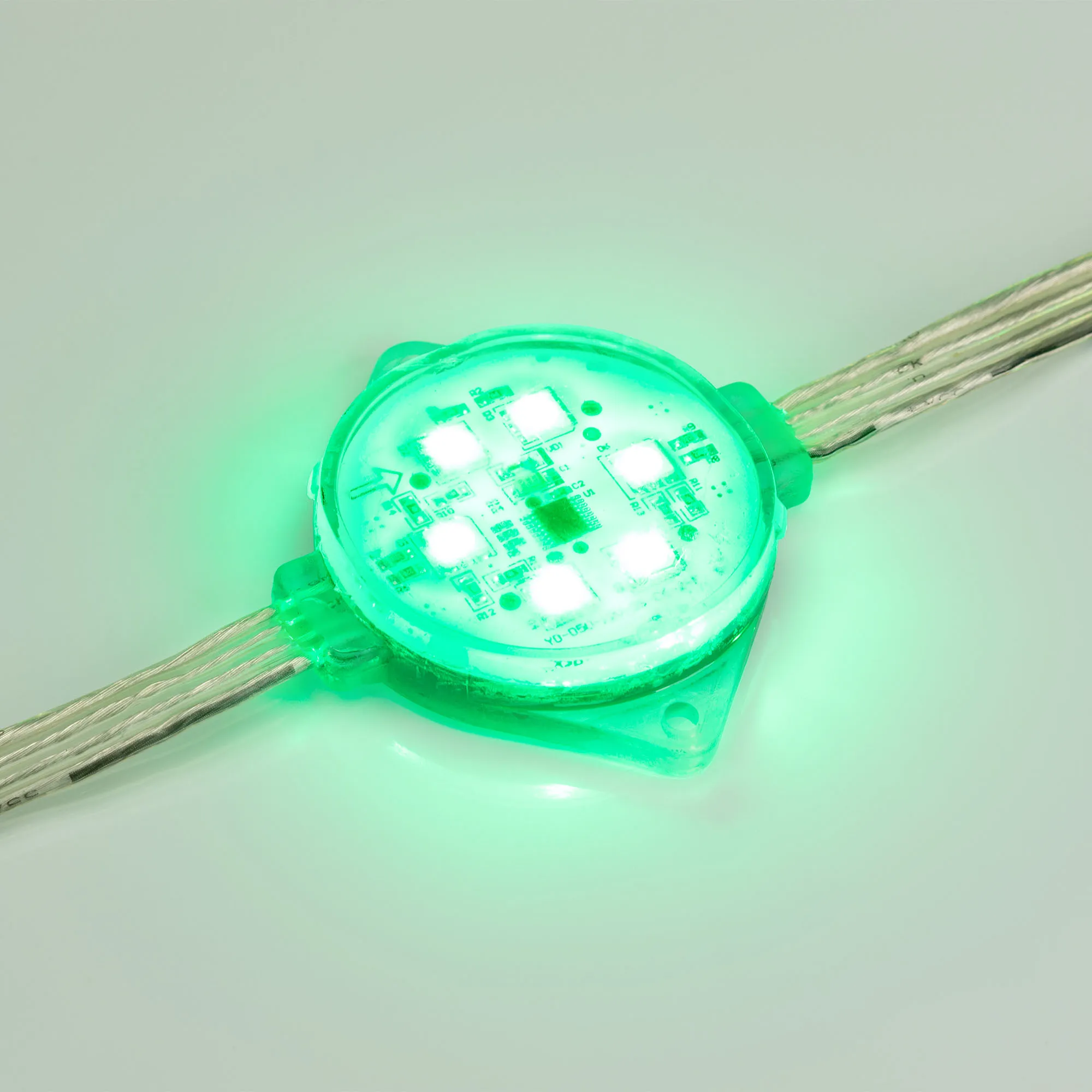 Управляемый светодиодный модуль SPI, RGB, микросхема MBI6021, напряжение 12 В, мощность 1.44 Вт, 6 светодиодов SMD 5060, угол 120°. Создание медиафасадов. 40 шт на проводе, расстояние между центрами модулей 230 мм, длина провода между модулями 175 мм. IP 68. Размер Ø49.5×13.6 мм. Гарантия 3 года.