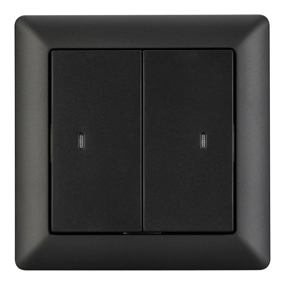 Универсальная двухклавишная встраиваемая настенная панель стандарта KNX с четырьмя кнопками. Цвет корпуса графит. Питание от шины KNX DC 21-30V. Размер 86х86х45 мм.
