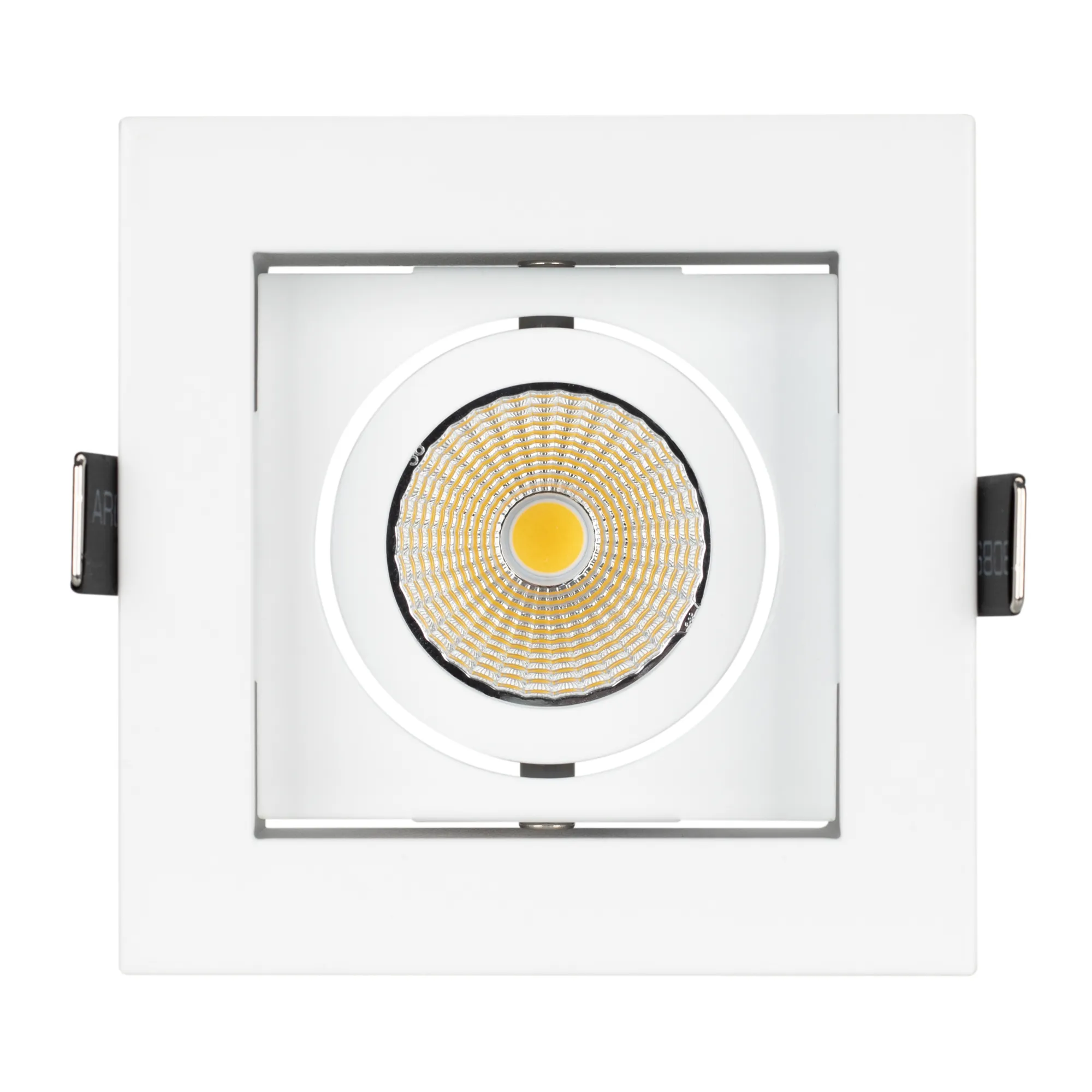 Встраиваемый карданный светильник. Угол 38° / 9Вт / ТЕПЛЫЙ БЕЛЫЙ 3000K / 680лм, CRI>80. Корпус из белого алюминия. Питание AC180-240V, 9Вт, в комплекте драйвер 200mA 30-45V. Размеры LxWxH: 102х102x85мм, отверстие для установки 85x85мм.