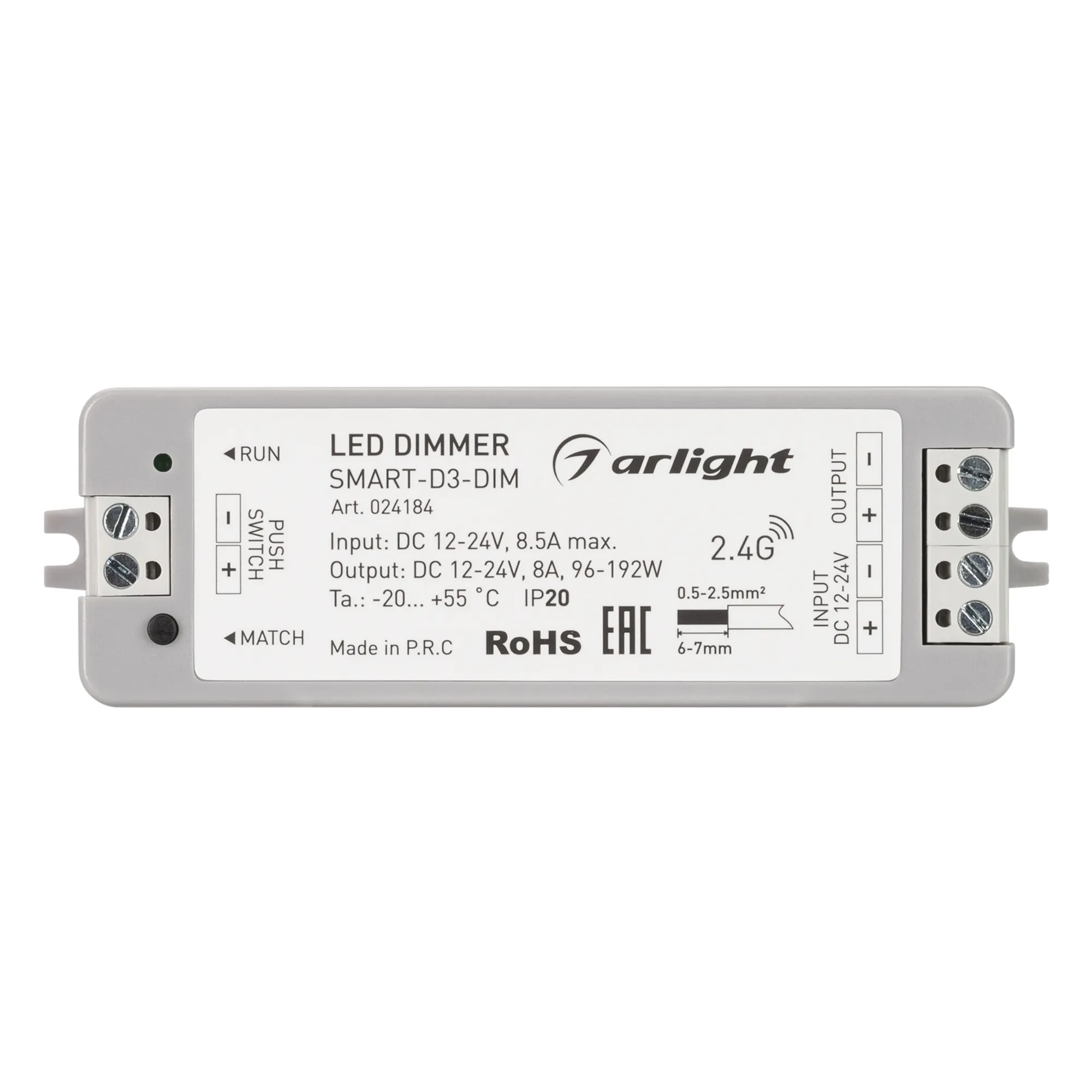 В магазине Мельковский Свет Вы можете купить "Диммер SMART-D3-DIM (12-24V, 8A, 2.4G) (Arlight, IP20 Пластик, 5 лет)"