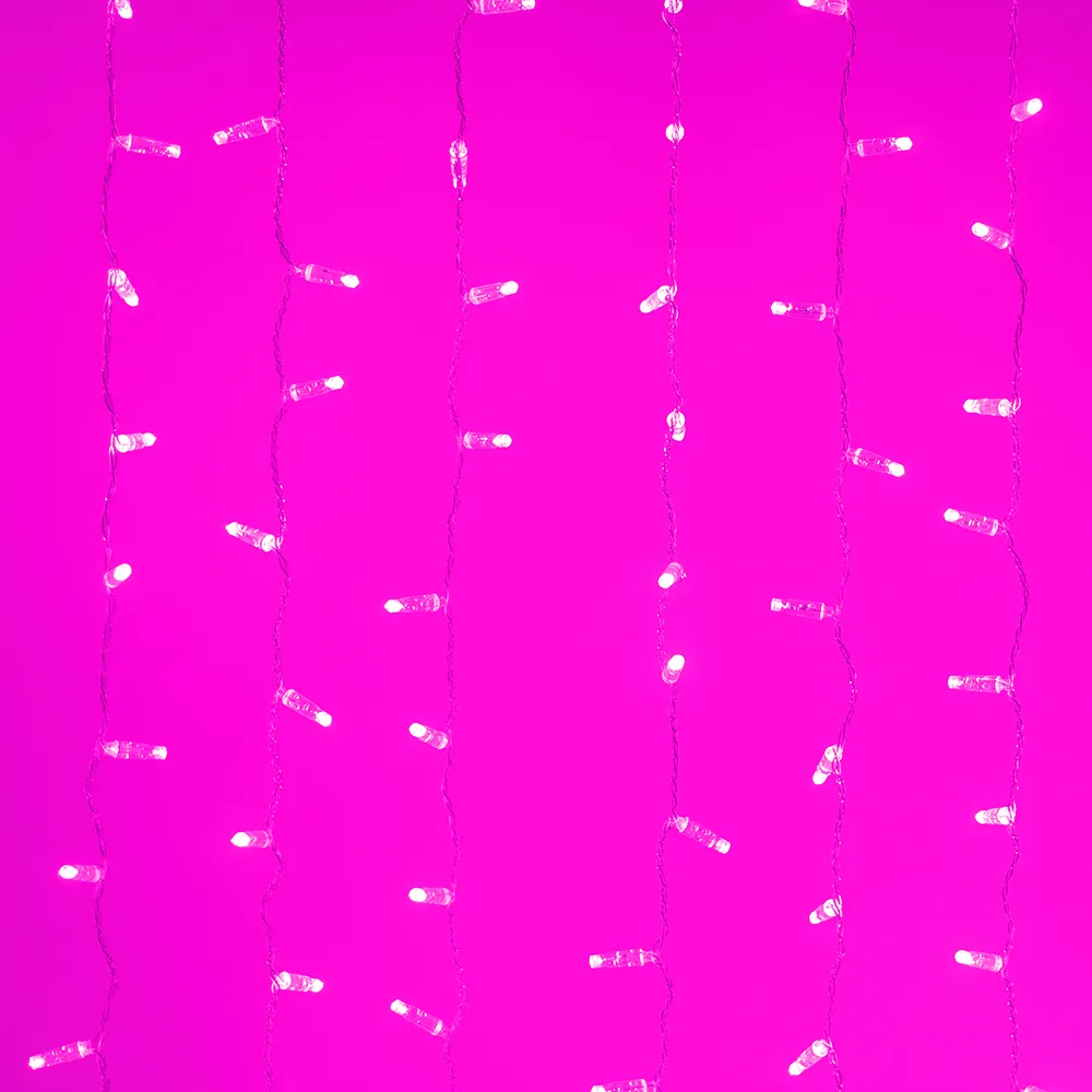 Светодиодный Занавес Classic. Размер 2000x1500 мм (длина 2000 мм, высота 1500 мм). 20 ниспадающих нитей длиной 1500 мм. 360 светодиода размером 7 мм. Цвет свечения РОЗОВЫЙ, постоянное свечение и 8 динамических эффектов с резким световым рисунком (прозрачная вогнутая линза). Провод прозрачный, ПВХ. Питание 230 В, Мощность 60 Вт, защита IP65, применение в помещении и на улице под навесом. Аксессуар для подключения и выбора режима свечения в комплекте.