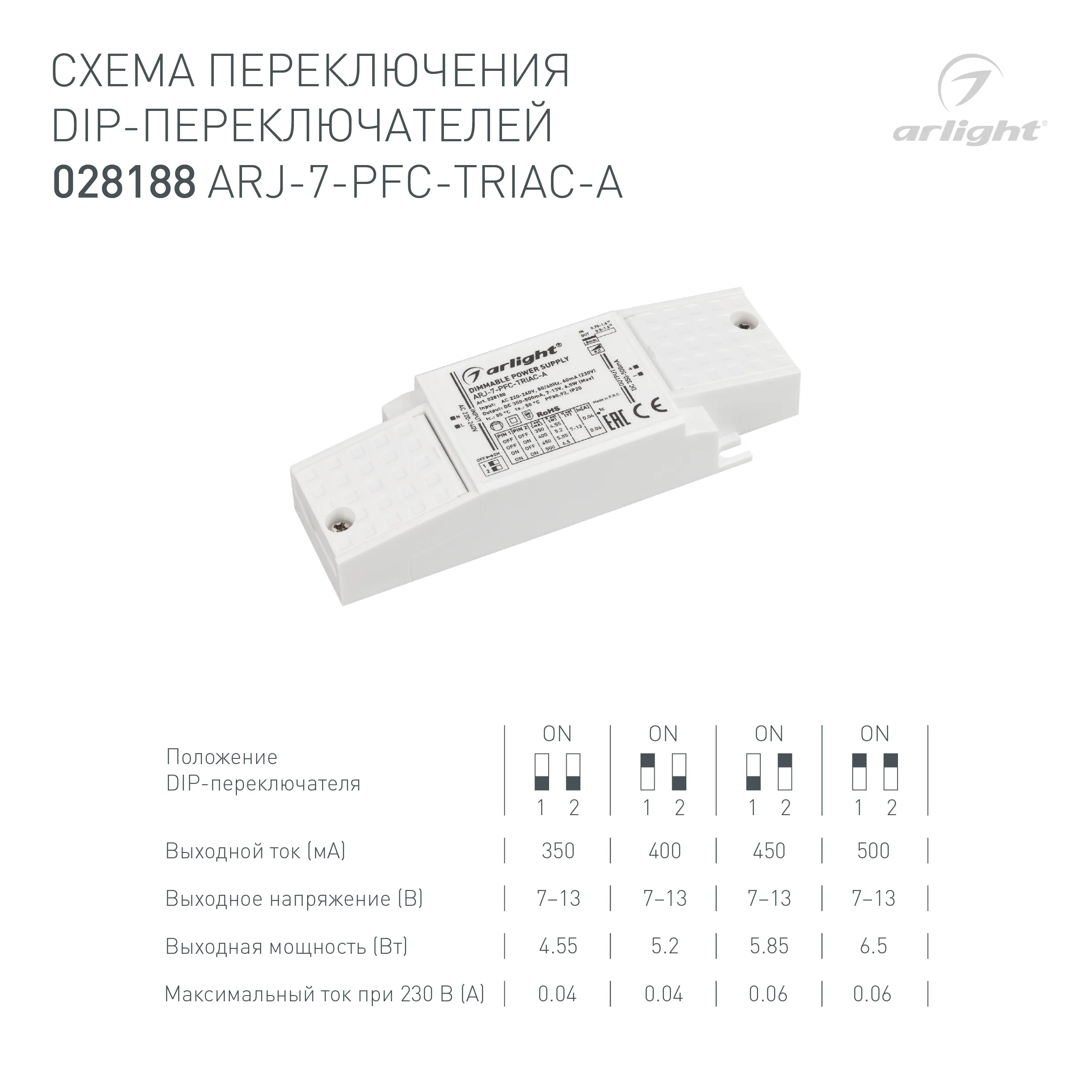 Блок питания ARJ-7-PFC-TRIAC-A (7W, 350-500mA) (Arlight, IP20 Пластик, 5 лет)