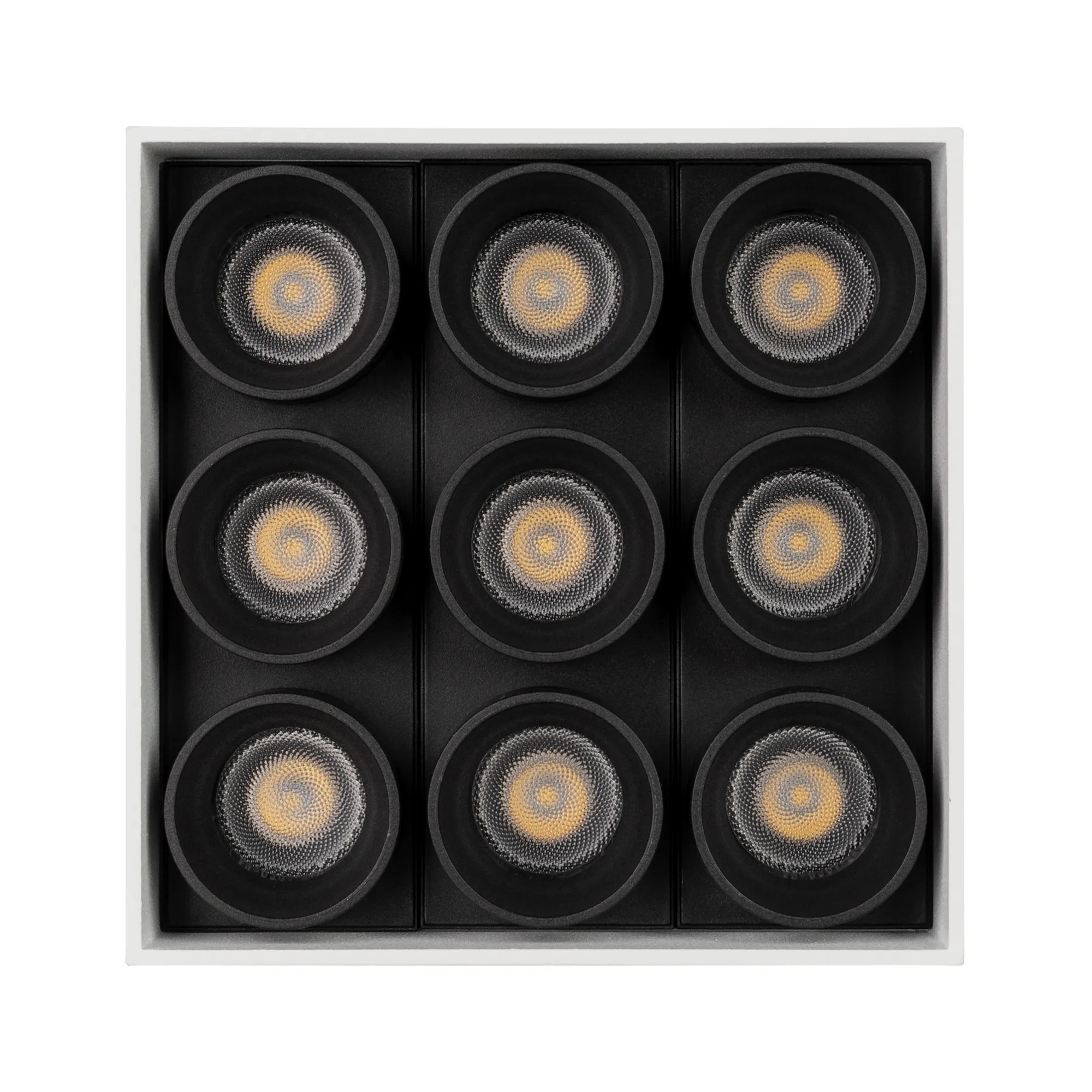 Накладной интерьерный светильник. Мощность 20 Вт, св. поток 1431 лм, 68 лм/Вт, теплый 3000 K, CRI>98, угол 30°, напряжение питания 230 В. Белый квадратный корпус из алюминия, степень защиты IP20. Размер: длина 95 мм, ширина 95 мм, высота 85 мм. Монтаж накладной. Драйвер 21-40 В, 600 мА, пульсация <5%.