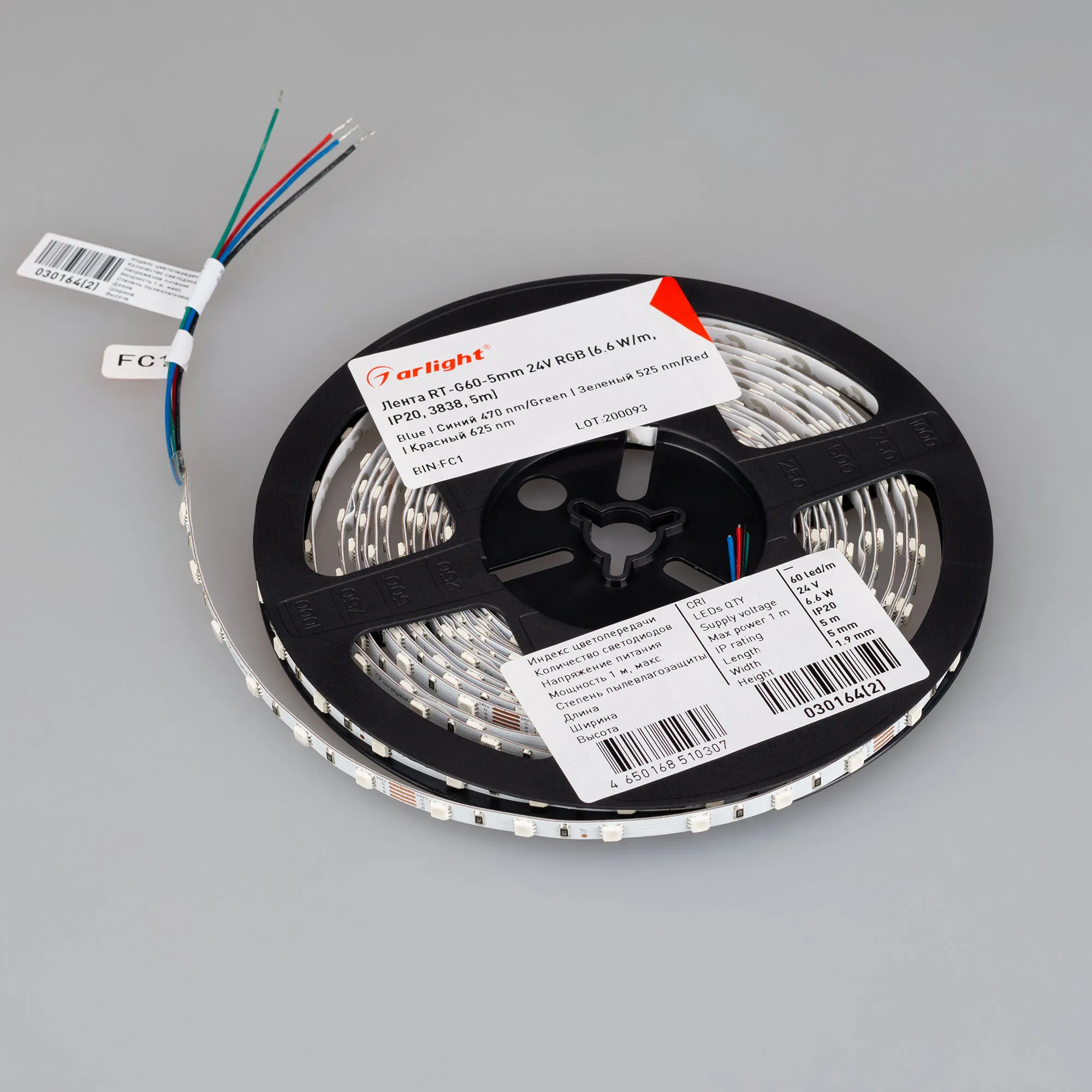Мультицветная лента серии RT G60. Светодиоды SMD 3838, 60 шт/м, белая плата шириной 5 мм, скотч 3M. Цвет RGB. Питание 24 В, мощность 6.6 Вт/м (33 Вт на 5 м), угол 120°. Размеры 5000x5x1.9 мм. Мин. отрезок 100 мм, 6 светодиодов. Цена за 1 м.