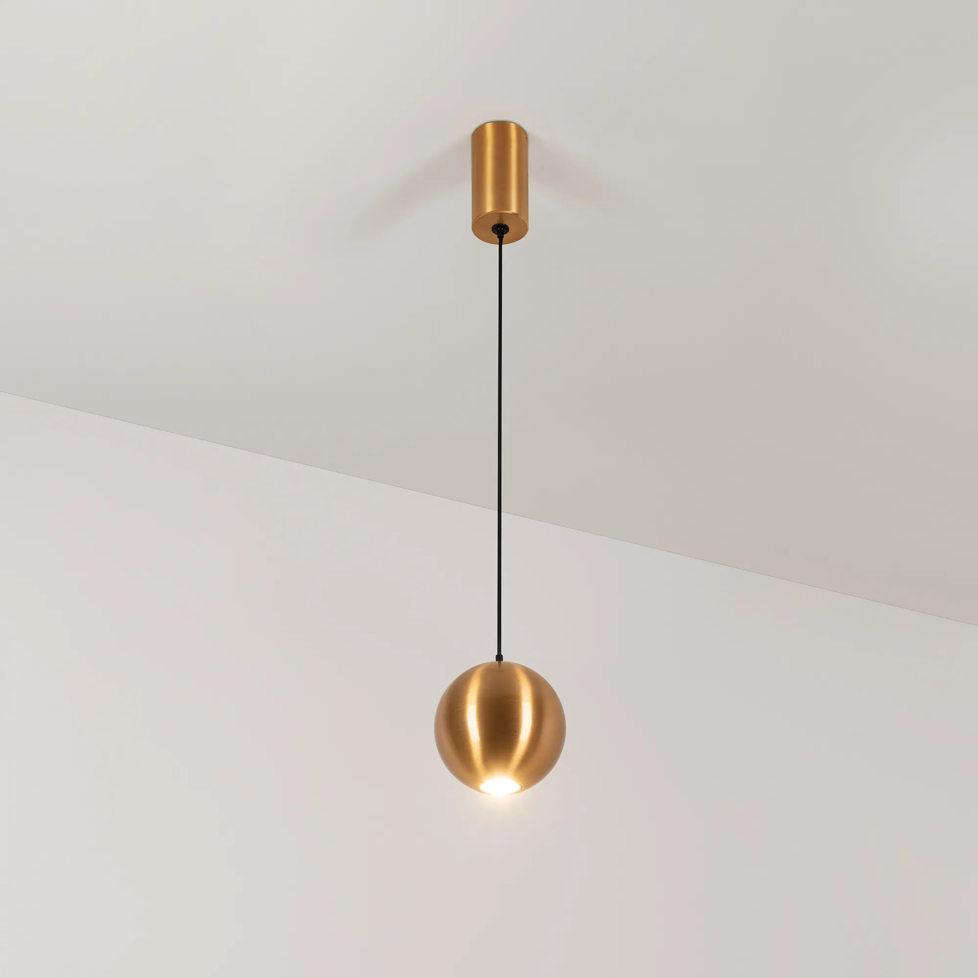 Подвесной светильник. Мощность 9 Вт, св. поток 650 лм, 73 лм/Вт, теплый 3000 K, CRI>80, угол 39°, напряжение питания 230 В. Золотой круглый корпус из алюминия, экран , степень защиты IP40. Размер: диаметр 100 мм, высота 97 мм. Монтаж подвесной, длина подвеса 1500мм, регулируемая. Габариты чаши Ø50x95 мм. Драйвер 28-42 В, 250 мА, пульсация <5%.