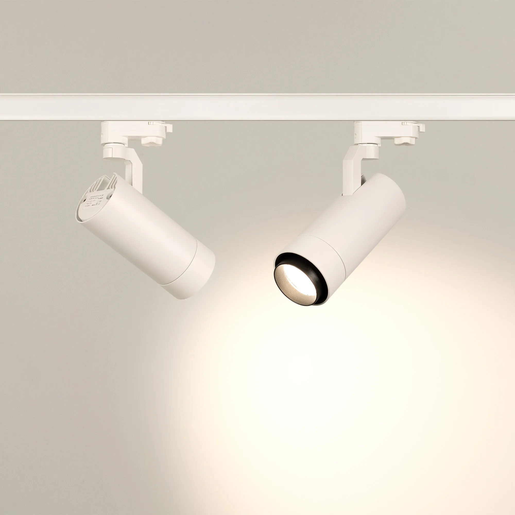 Светильник для треков/шин 4 провода с управлением DALI. Мощность 30 Вт, св. поток 2700 лм, 90 лм/Вт, теплый 3000 K, CRI>90, регулируемый угол 20-60°, напряжение питания 230 В. Белый круглый корпус из алюминия, материал линзы PMMA , степень защиты IP20. Размер: диаметр 80 мм, высота 181 мм. Монтаж на трек 3-фазный. Драйвер встроенный 9-48 В, 720 мА., пульсация <5%.