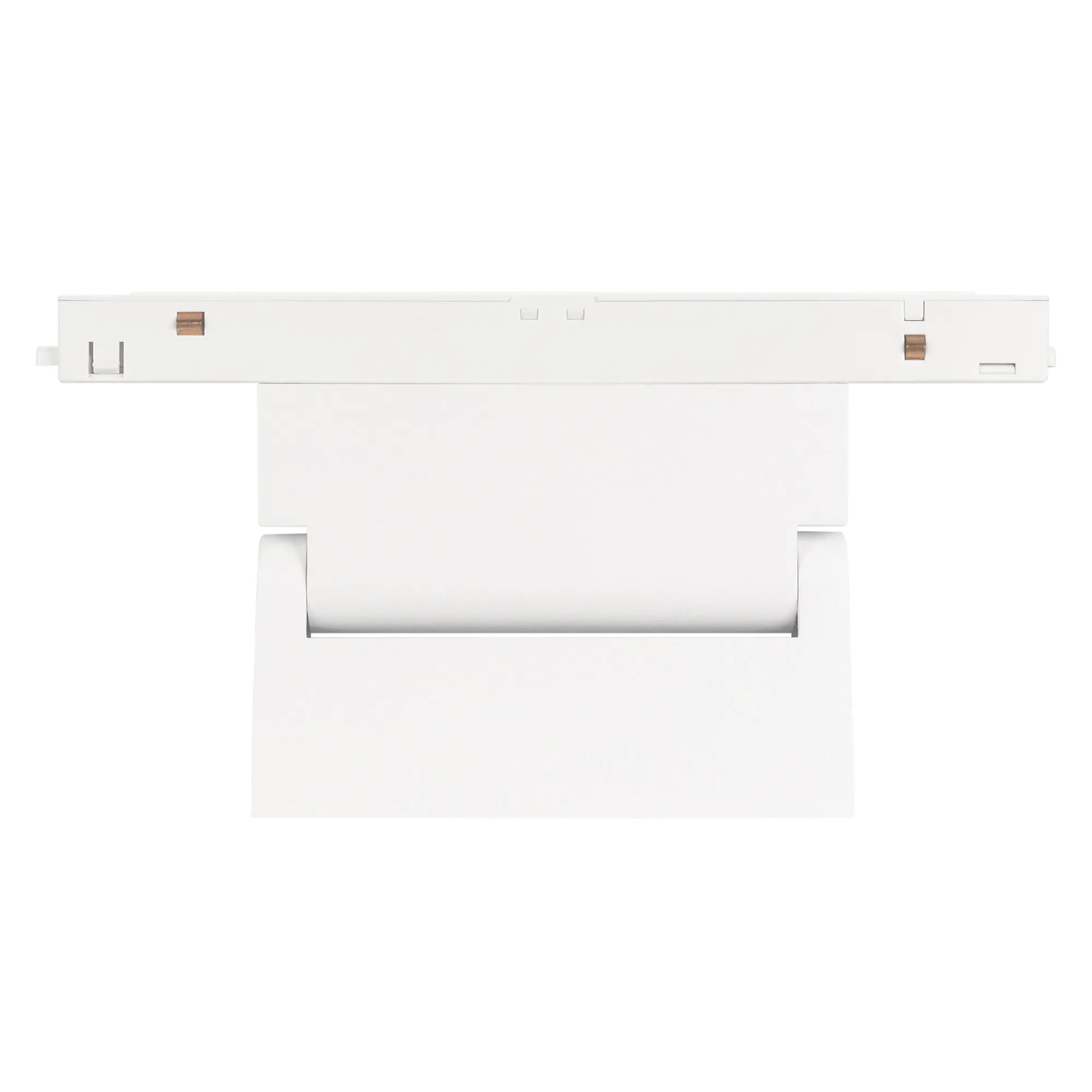 Светильник для магнитных треков MAG-ORIENT шириной 26 мм. Мощность 6 Вт, св. поток 250 лм, 42 лм/Вт, теплый 3000 K, CRI>90, угол 30°, напряжение питания 48 В. Белый прямоугольный корпус из металл, экран поликарбонат, степень защиты IP20. Размер: длина 204 мм, ширина 23 мм, высота 104 мм. Монтаж на трек MAG-ORIENT. Пульсация <1%.