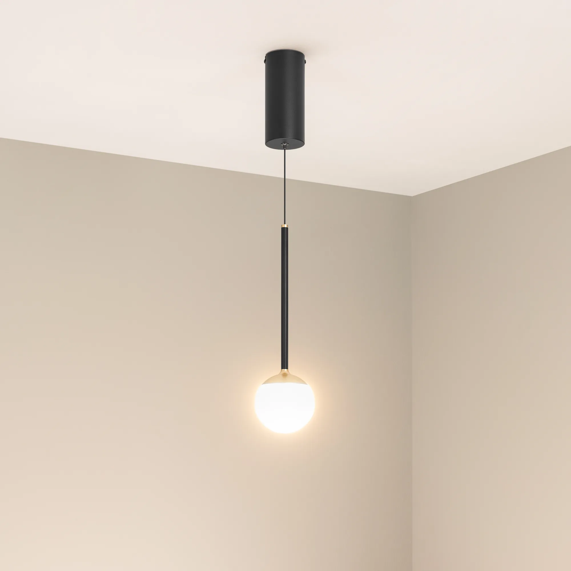 Подвесной светильник. Мощность 8 Вт, св. поток 620 лм, 80 лм/Вт, теплый 3000 K, CRI>90, угол 180°, напряжение питания 230 В. Черно-золотой круглый корпус из алюминия и стали, рассеиватель акрил, степень защиты IP20. Размер: диаметр 100 мм, высота ножки 244 мм, высота с плафоном 351 мм, размер чаши: диаметр 70 мм, высота 160 мм. Монтаж подвесной, длина подвеса 1150 мм. Драйвер 13-24 В, 300 мА, пульсация <1%.