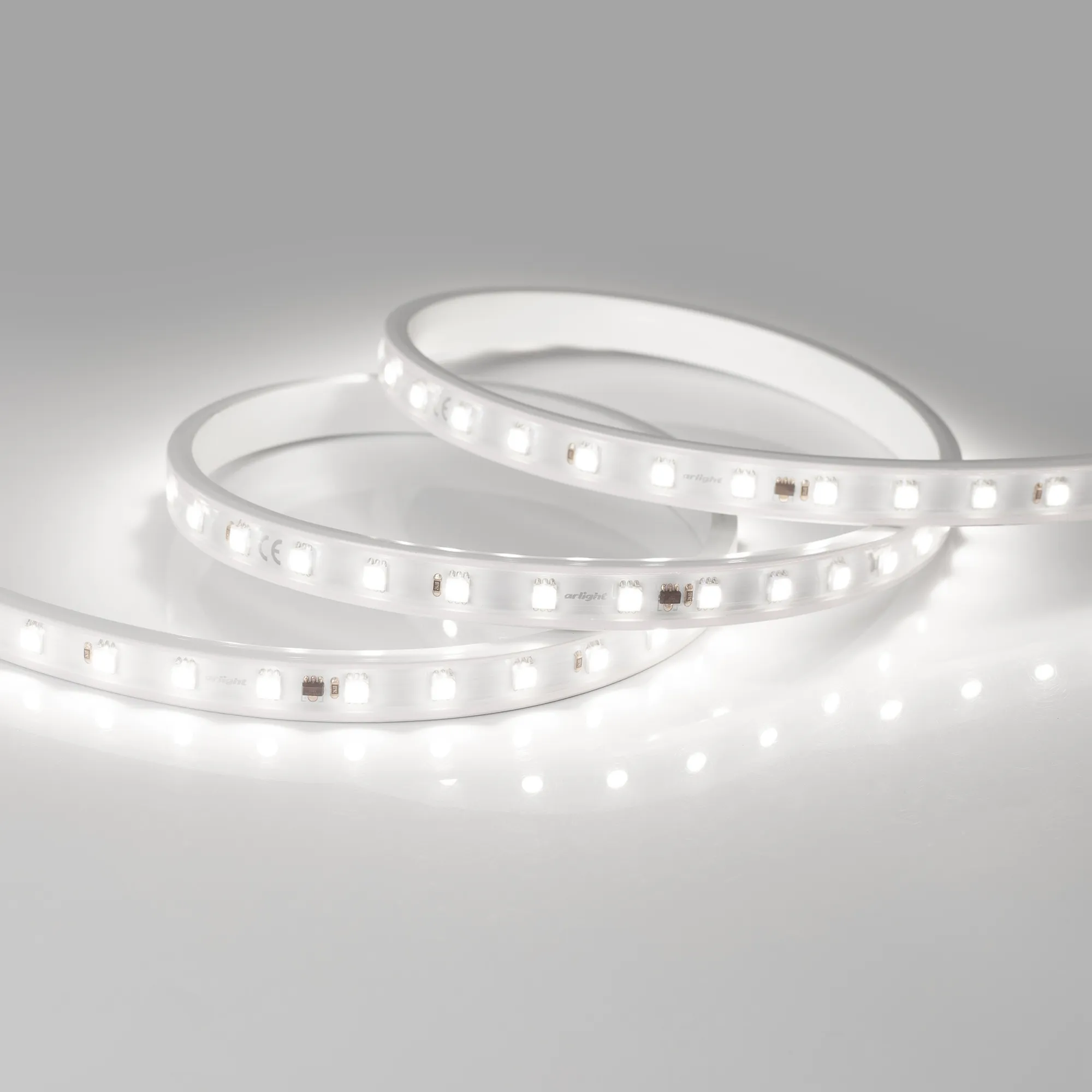Светодиодная герметичная лента ARL серии B54, IP65 (PV - трубка, ПВХ экструзия). Светодиоды 5060, 54 шт/м, белая плата шириной 12 мм. Цвет БЕЛЫЙ 6000K, индекс цветопередачи CRI>90, угол 120°. Питание 230 В, мощность 8 Вт/м (80 Вт на 10 м). Размеры 50000x15.5x6 мм. Мин. отрезок 500 мм, 27 светодиодов. Цена за 1 м. Светодиодная лента крепится с помощью скоб (приобретаются отдельно), 3M скотч отсутствует. Катушка 50 м.
