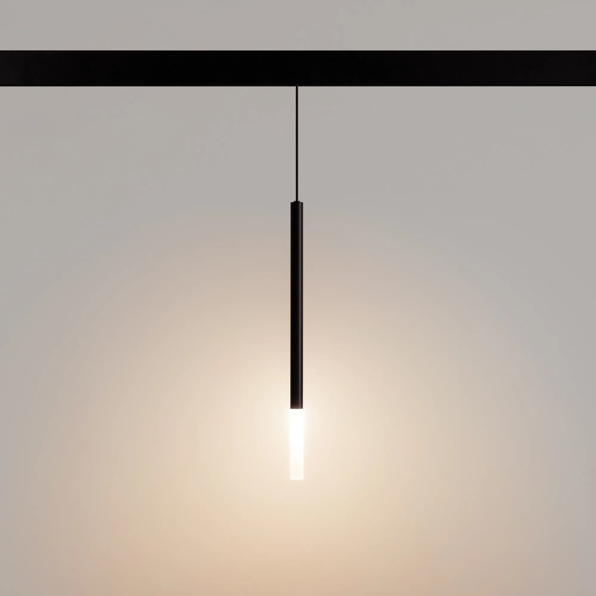 Светильник для магнитных треков MAG-ORIENT шириной 26 мм. Мощность 6 Вт, св. поток 100 лм, теплый 3000 K, CRI>90, угол 180°, напряжение питания 48 В. Черный цилиндрический корпус из металл, степень защиты IP20. Размер: длина светоизлучающего модуля 120 мм, длина светильника 450 мм ширина 20 мм, высота с учетом подвеса 2000 мм. Монтаж на трек MAG-ORIENT. Пульсация <1%. UGR<16. Подвес регулируется.