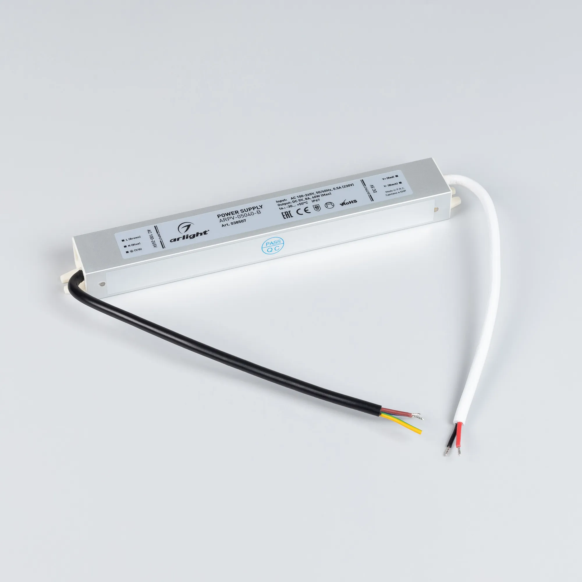 Источник напряжения с гальванической развязкой для светодиодных изделий. Входное напряжение 100-240 VAC. Выходные параметры: 5 В, 8 А, 40 Вт. Герметичный пластиковый корпус IP 67. Рабочая температура -30…+50C⁰. Габаритные размеры длина 223 мм, ширина 30 мм, высота 20 мм. Гарантийный срок 3 года.