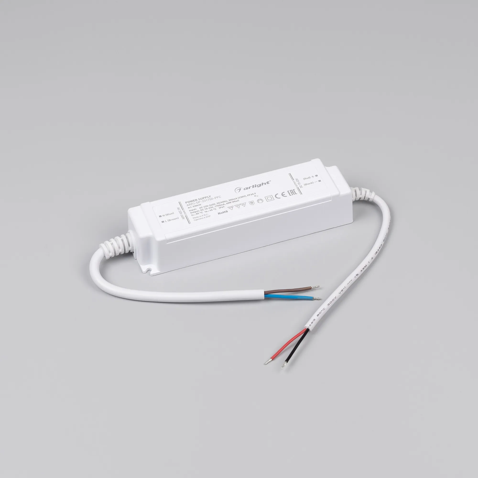 Источник тока с гальванической развязкой для светильников и мощных светодиодов. Входное напряжение 220-240 VAC. Выходные параметры: 15-23 В, 1750 mА, 40 Вт. Встроенный PFC >0.9. Герметичный пластиковый корпус IP 67. Габаритные размеры длина 150 мм, ширина 40 мм, высота 30 мм. Гарантийный срок 5 лет.