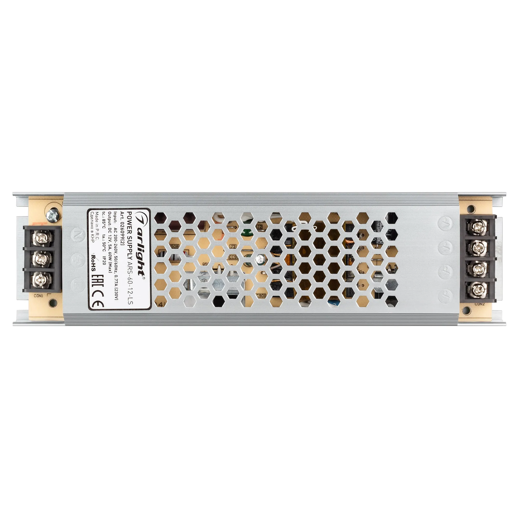 Источник напряжения с гальванической развязкой для светодиодных изделий. Входное напряжение 200-240 VAC. Выходные параметры: 12 В, 5 А, 60 Вт. Встроенный PFC >0,5. Негерметичный алюминиевый сетчатый корпус IP 20. Габаритные размеры длина 195 мм, ширина 53 мм, высота 22 мм. Гарантийный срок 2 года.