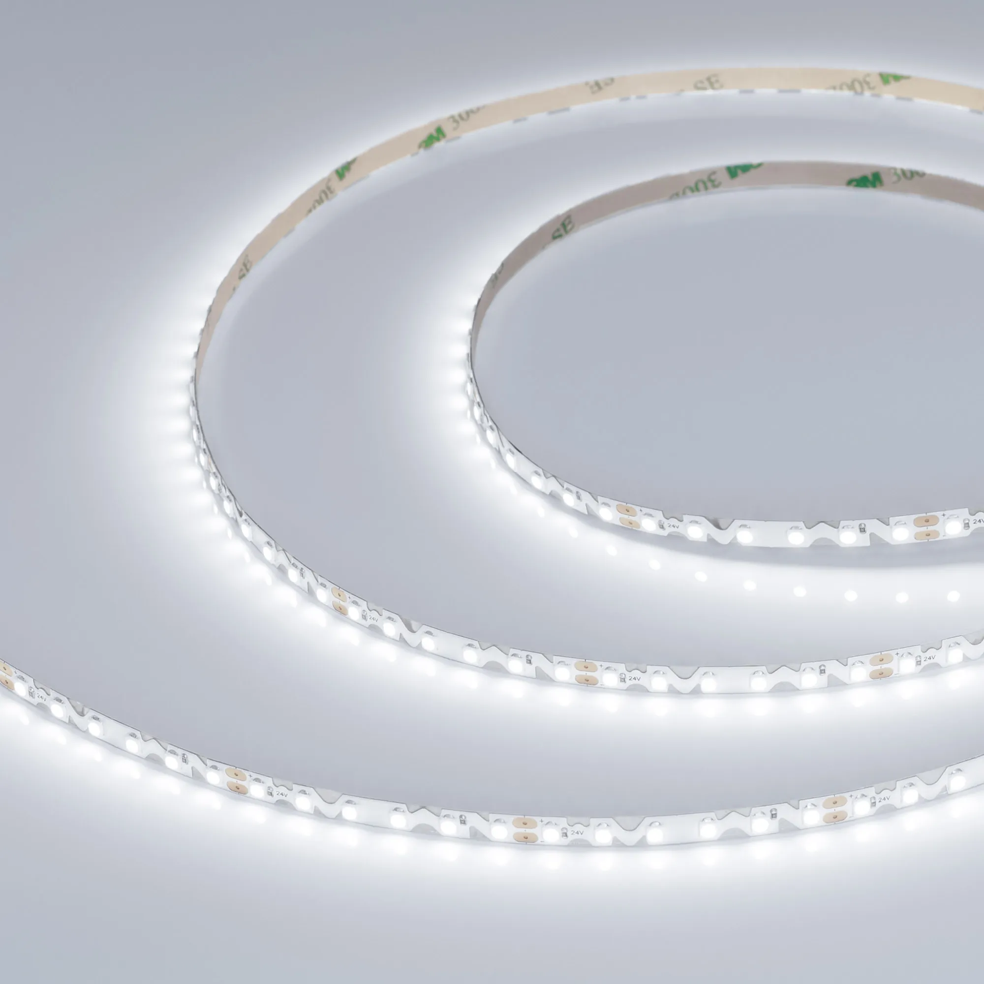 Гибкая светодиодная лента RZ серии A120 с фигурной платой в форме волны, легко изгибается на плоскости. Светодиоды SMD 2835, 120 шт/м, белая плата шириной 6 мм, скотч 3М. Цвет БЕЛЫЙ 6000K, индекс цветопередачи CRI>90, угол 120°. Питание 24 В, мощность 9.6 Вт/м (48 Вт на 5 м). Размеры 5000х6х1.3 мм. Мин. отрезок 50 мм, 6 светодиодов. Цена за 1 м. Обязательна установка на профиль.