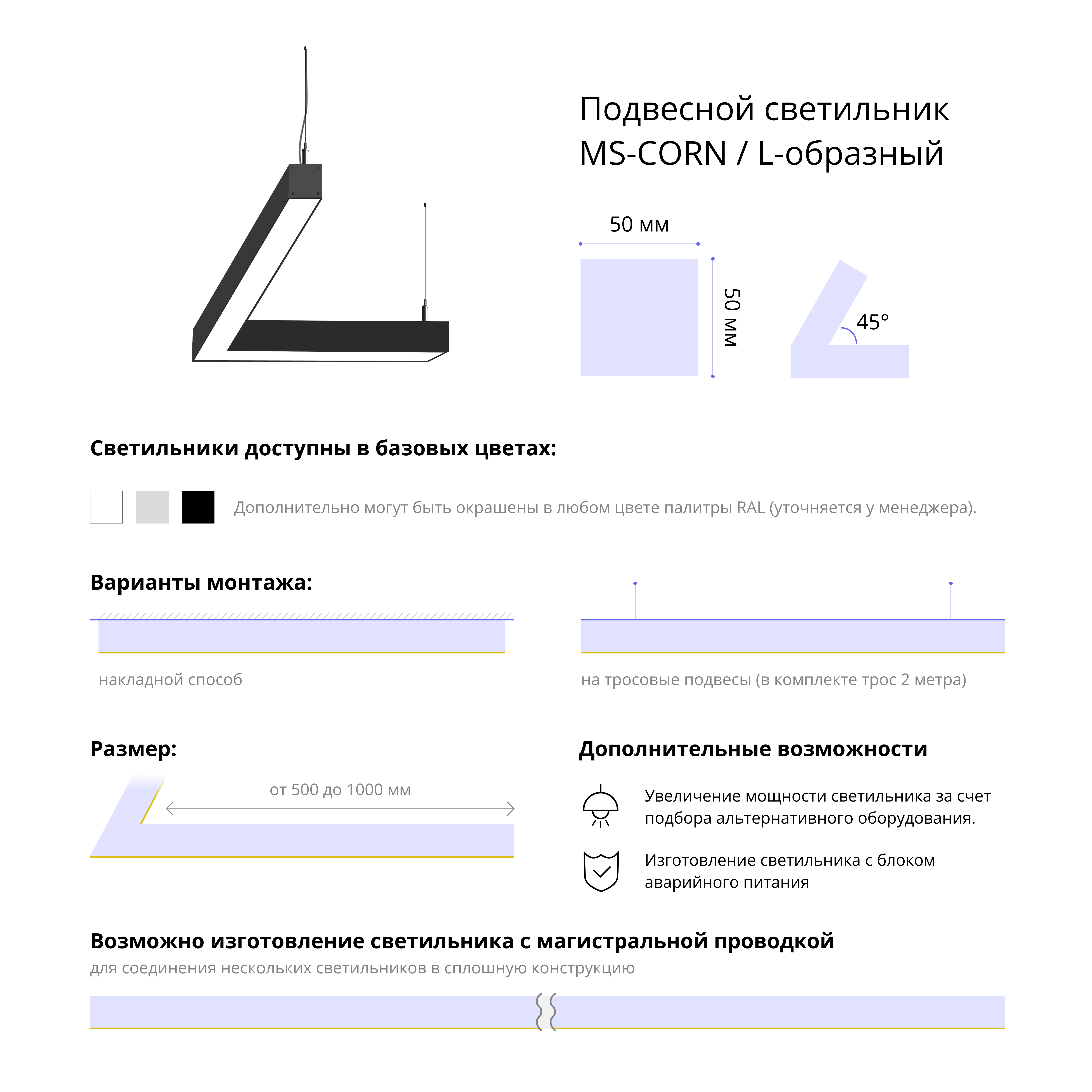 Светодиодный фигурный светильник MS-CORN L-образный 45гр. размер профиля 50х50мм длиной 750х750мм мощностью 30W. Светильник собирается в алюминиевом корпусе с матовым рассеивателем, который дает равномерную засветку по всей площади.