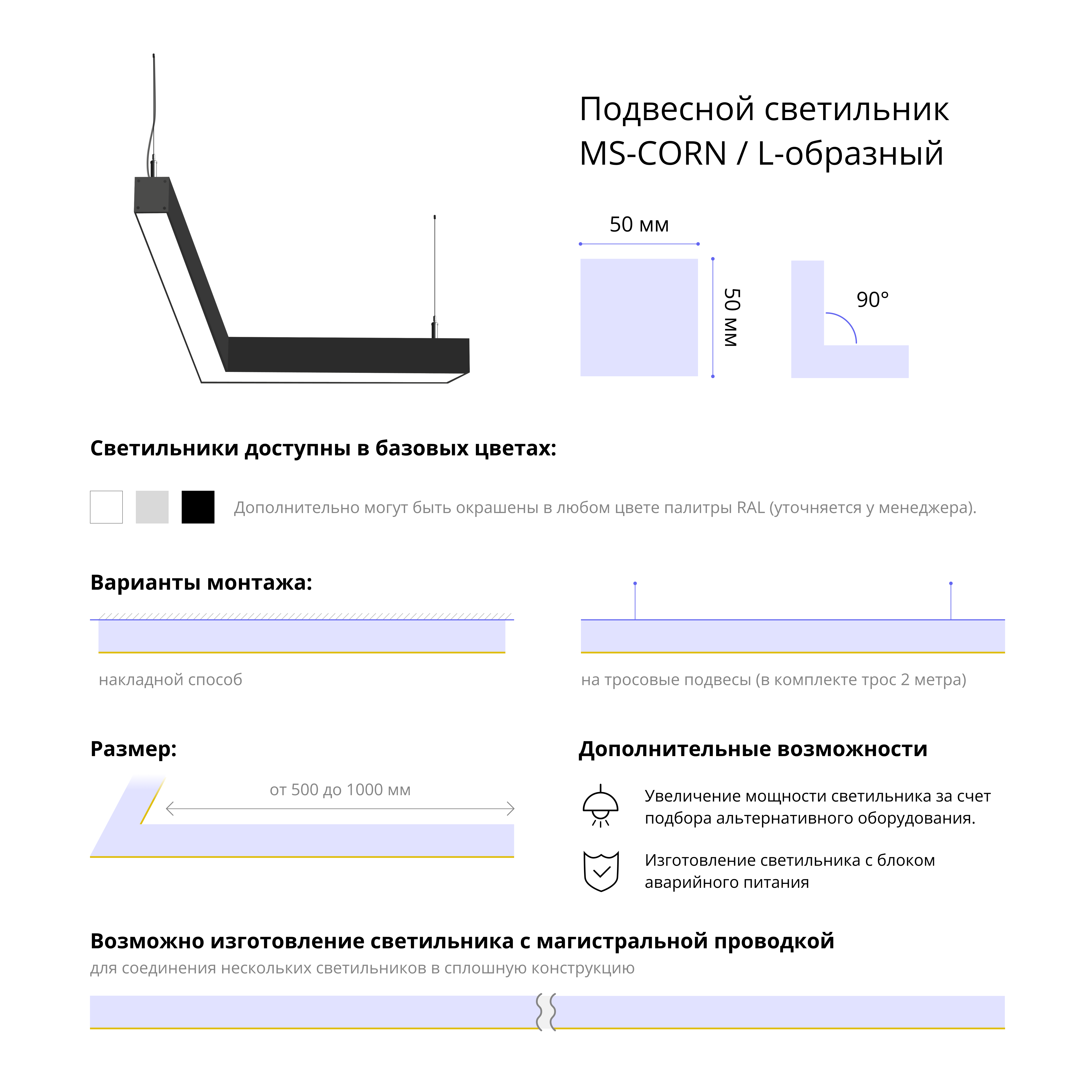 - Варианты монтажа: на тросовые подвесы (в комплекте трос 2 метра) и накладным способом.