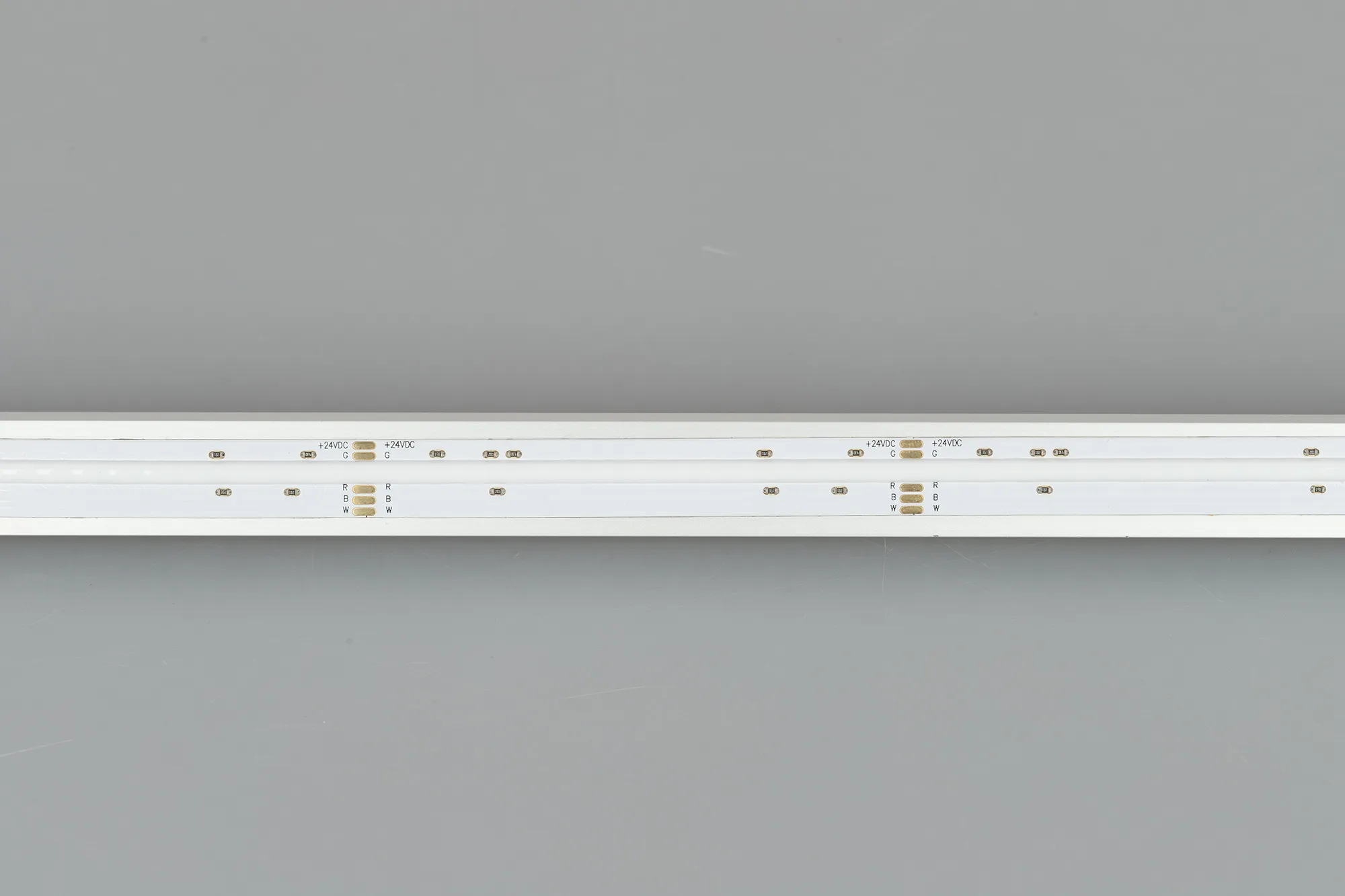 Светодиодная лента сплошного свечения COB серии X768. Светодиоды CSP, 768 шт/м, белая плата шириной 12 мм, скотч 3M. Цвет RGB + БЕЛЫЙ 6000K, индекс цветопередачи CRI>90, угол 120° Питание 24 В, мощность 15 Вт/м (75 Вт на 5 м). Размеры 5000x12x2.2мм. Мин. отрезок 83.3 мм. Цена за 1 м. Обязательна установка на профиль.