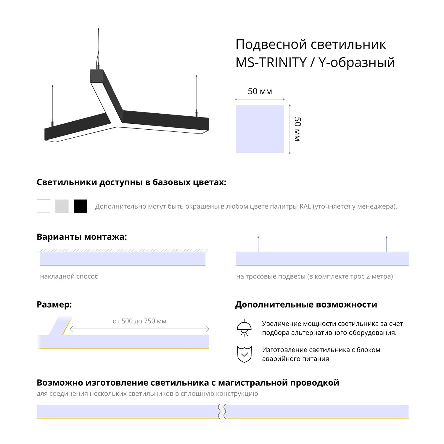 Cветодиодный фигурный светильник MS-TRINITY Y-образный размер профиля 50x50мм длиной 3х750мм мощностью 80W. Светильник собирается из алюминиевого основния с матовым рассеивателем, который дает равномерную засветку по всей площади.