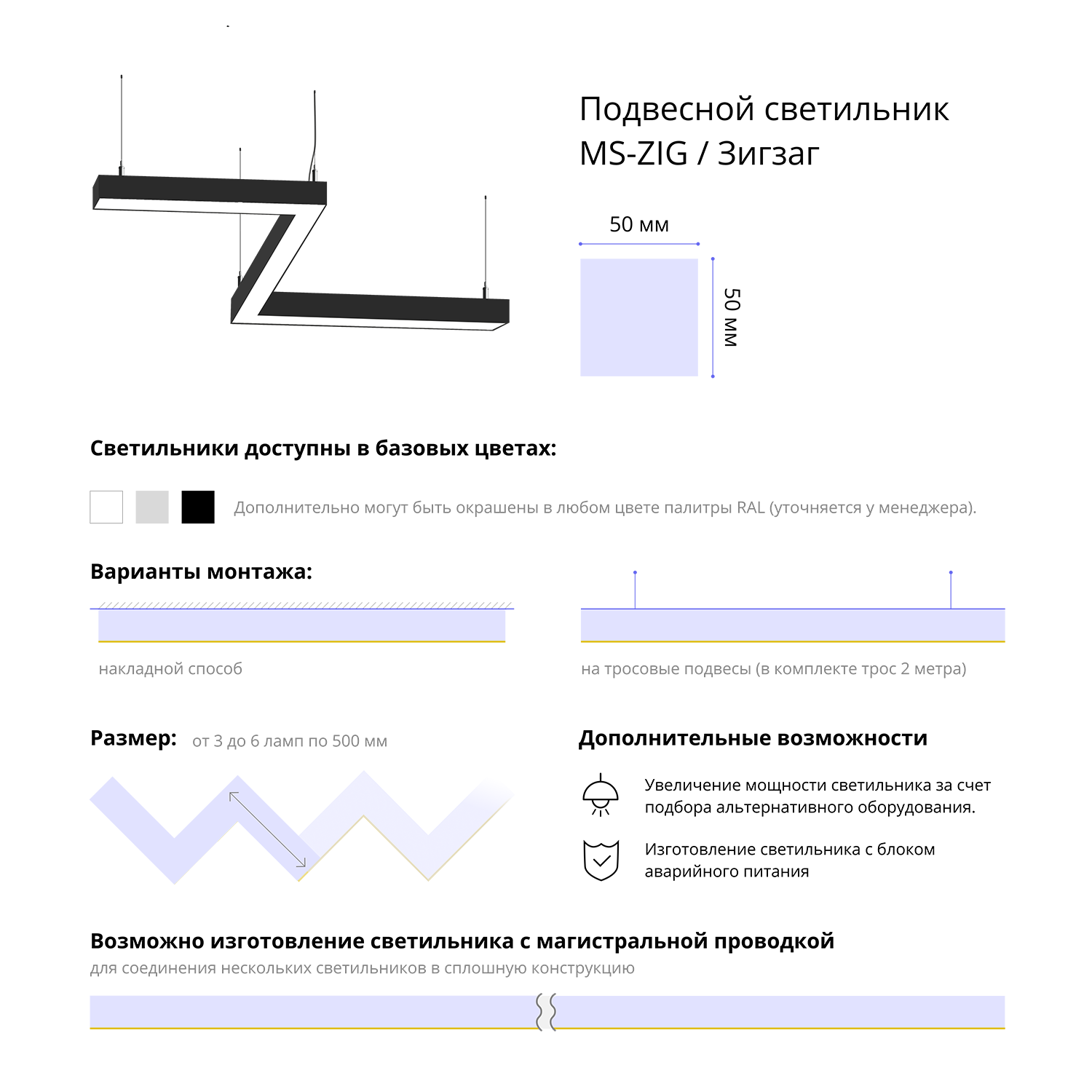 Cветодиодный фигурный светильник MS-ZIG Зигзаг размер профиля 50x50мм длиной 3х500мм мощностью 30W. Светильник собирается из алюминиевого основния с матовым рассеивателем, который дает равномерную засветку по всей площади.