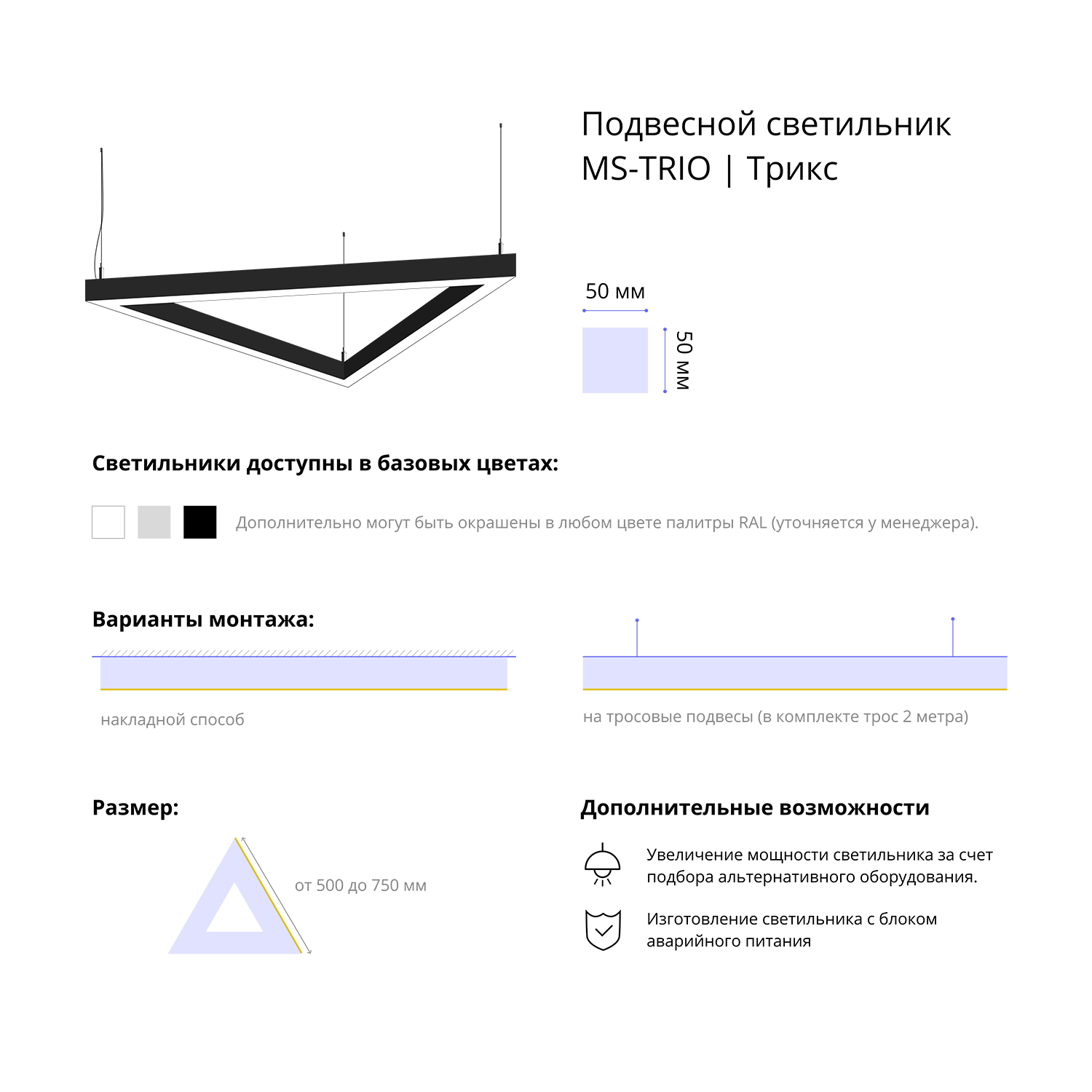 Cветодиодный фигурный светильник MS-TRIO-O Треугольник размер профиля 50x50мм длиной 3х750мм мощностью 80W. Светильник собирается из алюминиевого основния с матовым рассеивателем, который дает равномерную засветку по всей площади.