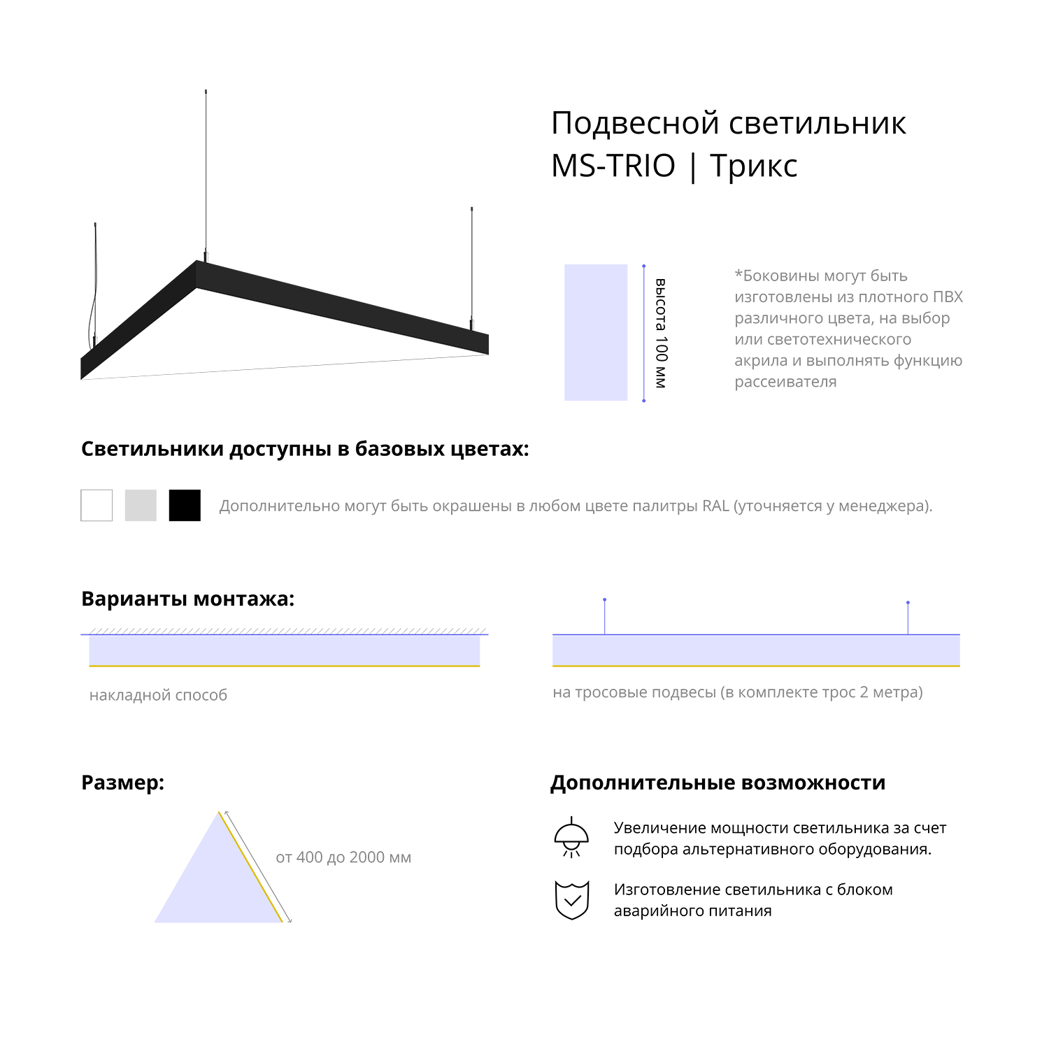 Cветодиодный фигурный светильник MS-TRIO Трикс длиной 1600мм мощностью 140W. Светильник собирается из алюминиевого основния с матовым рассеивателем, который дает равномерную засветку по всей площади.
