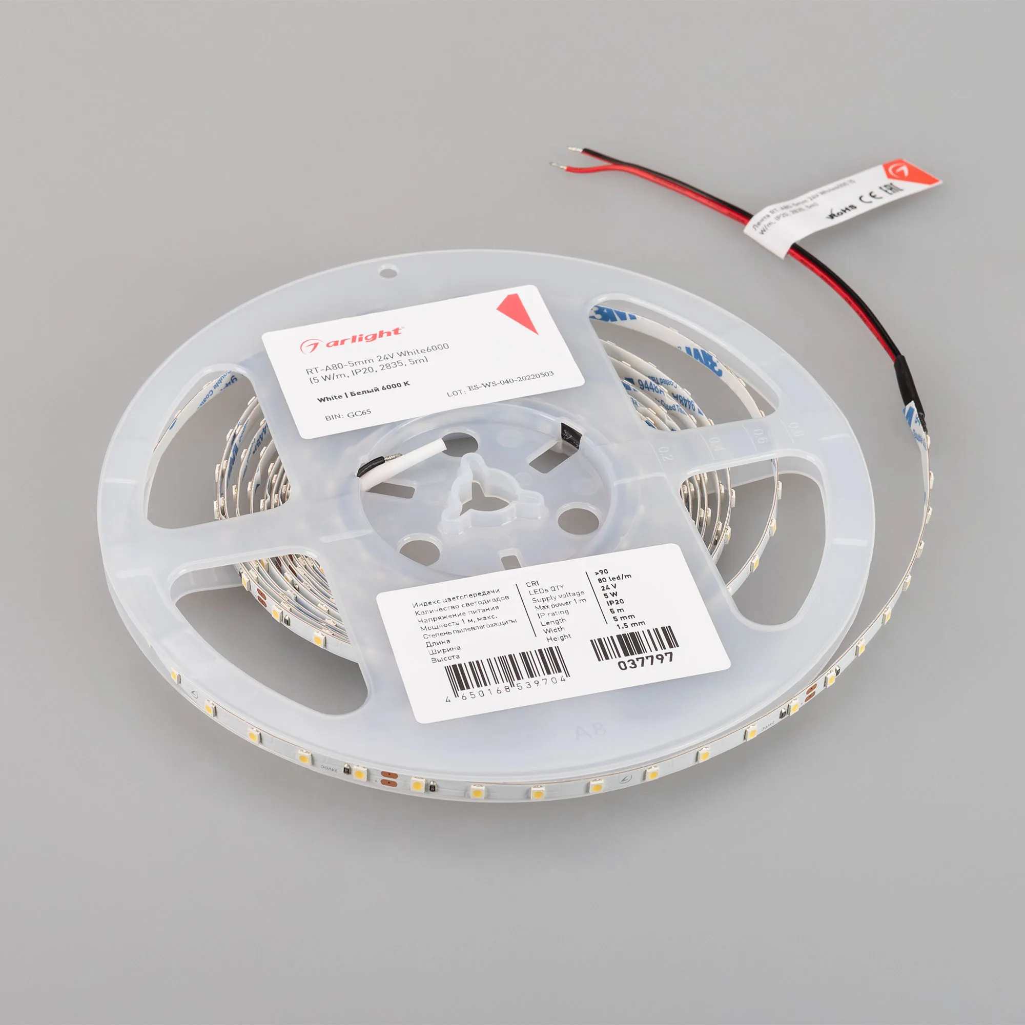 Светодиодная узкая лента RT серии A80. Светодиоды SMD 2835, 80 шт/м, белая плата шириной 5 мм, скотч 3M. Цвет БЕЛЫЙ 6000K, индекс цветопередачи CRI>90, угол 120°. Питание 24 В, мощность 5 Вт/м (25 Вт на 5 м). Размеры 5000х5х1.5 мм. Мин. отрезок 100 мм, 8 светодиодов. Цена за 1 м. Рекомендуется установка на профиль.