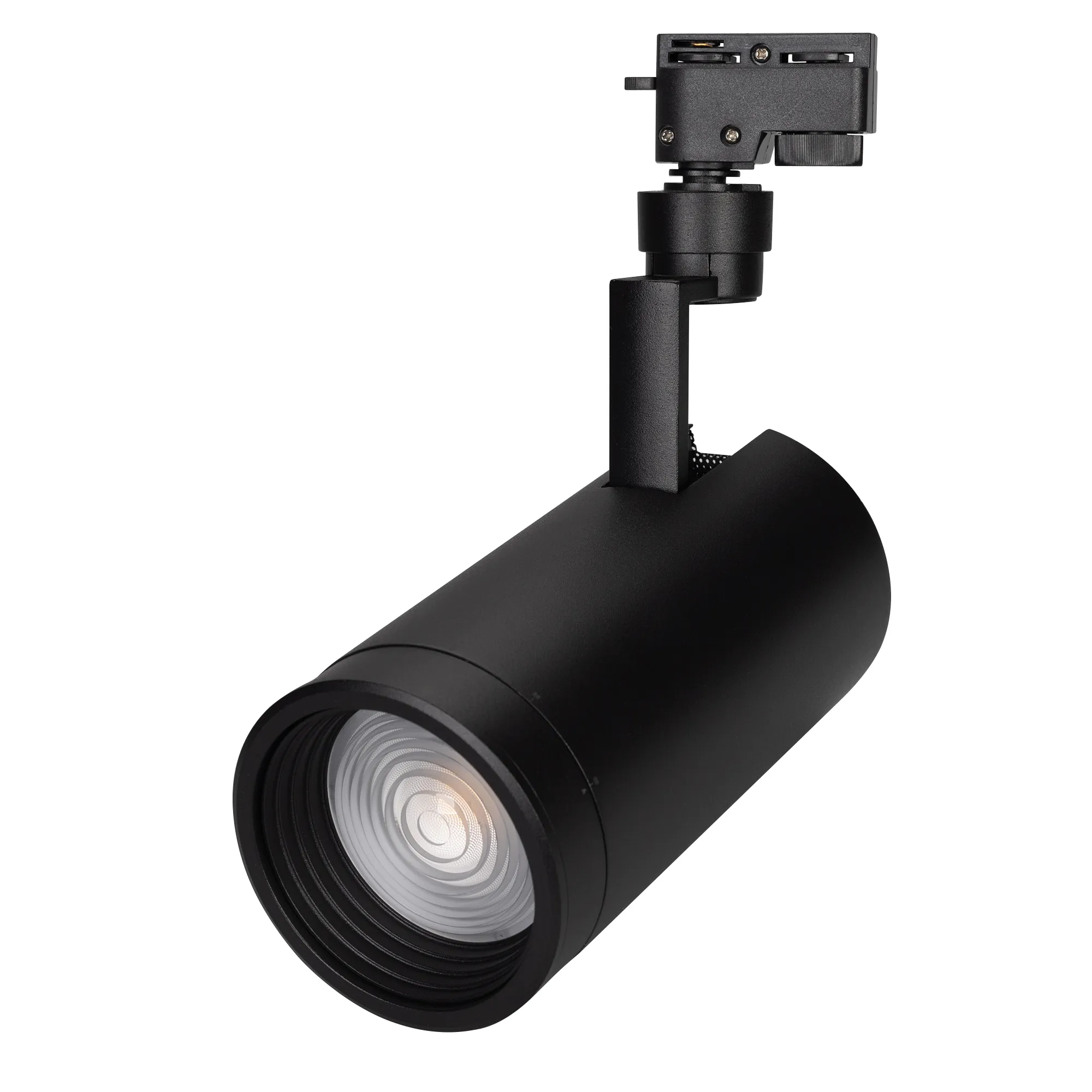 Поставка под заказ от 100 шт. Светильник подвесной для треков/шин 2 провода, 30Вт. Цвет свечения ТЕПЛЫЙ 3000K, световой поток 2400-3000лм, регулируемый угол 20-60°, CRI>90. Корпус круглый, металл, цвет черный, IP20. Размеры DxHxL Ø100x220x180мм. Входное напряжение AC220-240V, мощность 30Вт. Драйвер встроенный (30-40V, 750mA).