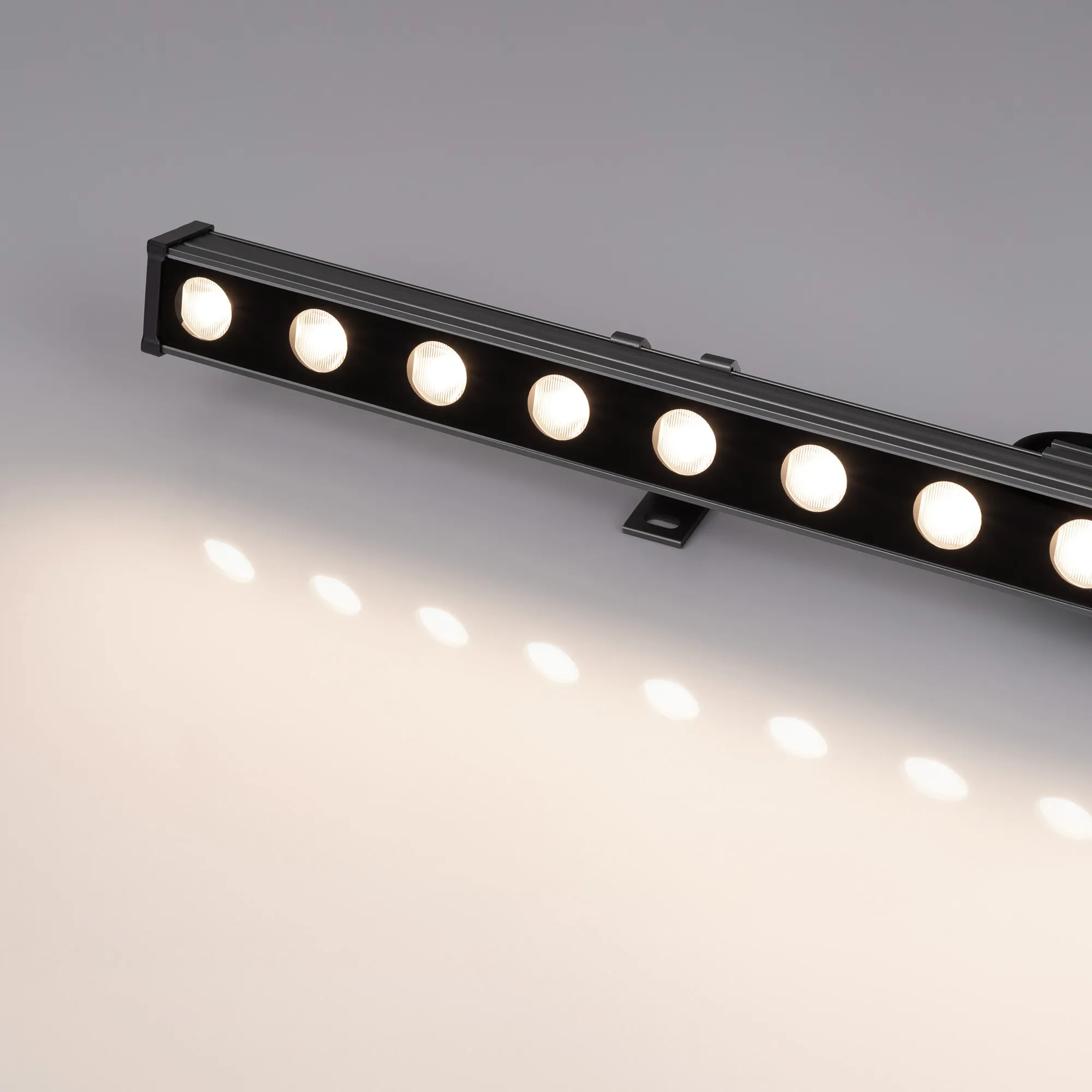 Линейный прожектор. Мощность 18 Вт, св. поток 1440 лм, 80 лм/Вт, дневной 4000 K, CRI>80, угол 15x60°, напряжение питания 230 В. Серый прямоугольный корпус из алюминия, экран стекло, степень защиты IP65. Размер: длина 760 мм, ширина 40 мм, высота 30 мм. Монтаж на кронштейнах.