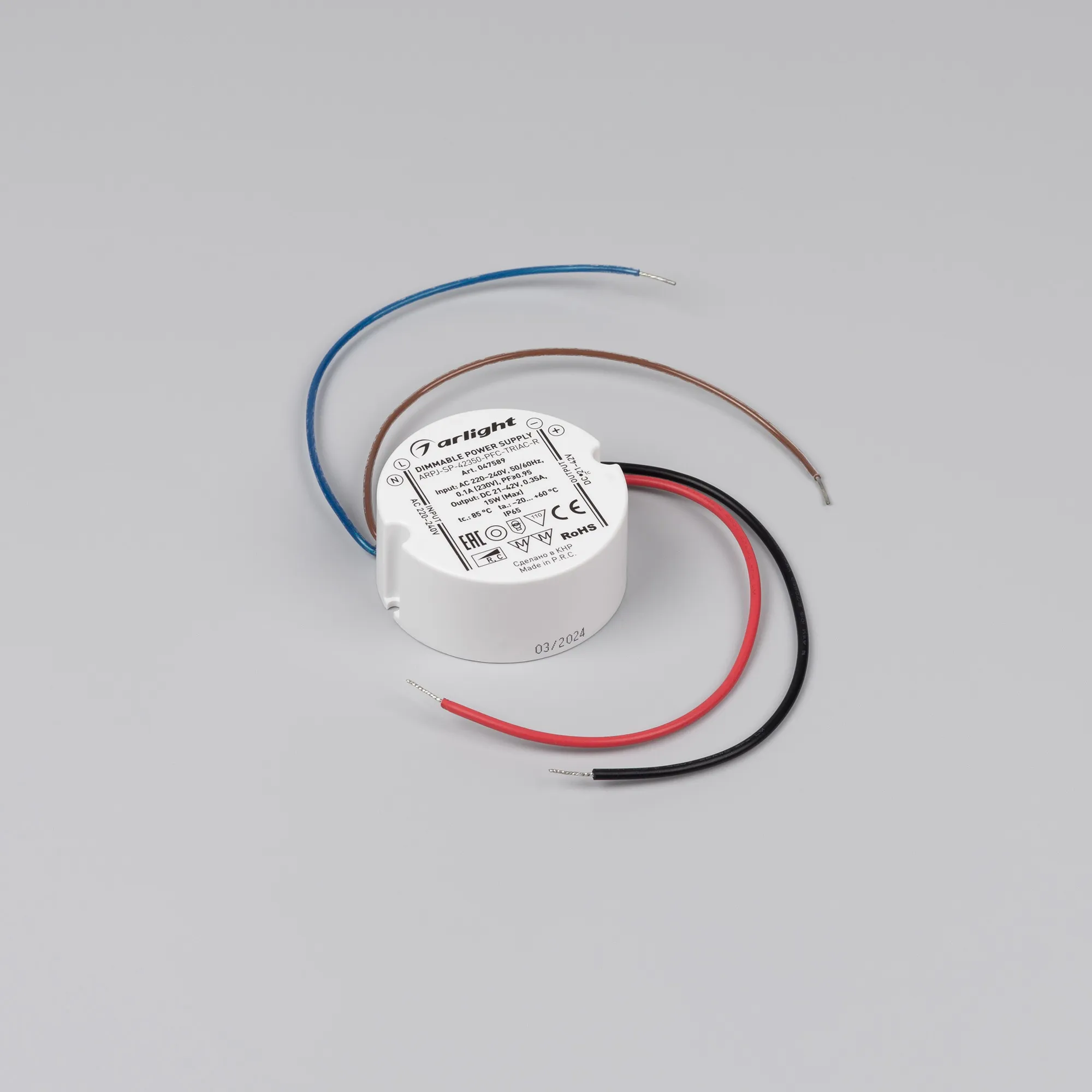 Диммируемый источник тока по стандарту TRIAC с гальванической развязкой для светильников и мощных светодиодов. Входное напряжение 220-240 VAC. Выходные параметры: 21-42 В, 350 mА, 15 Вт. Встроенный PFC >0,95. Герметичный пластиковый корпус IP 65. Габаритные размеры диаметр в окружности Ø56, высота 25 мм. Гарантийный срок 5 лет.