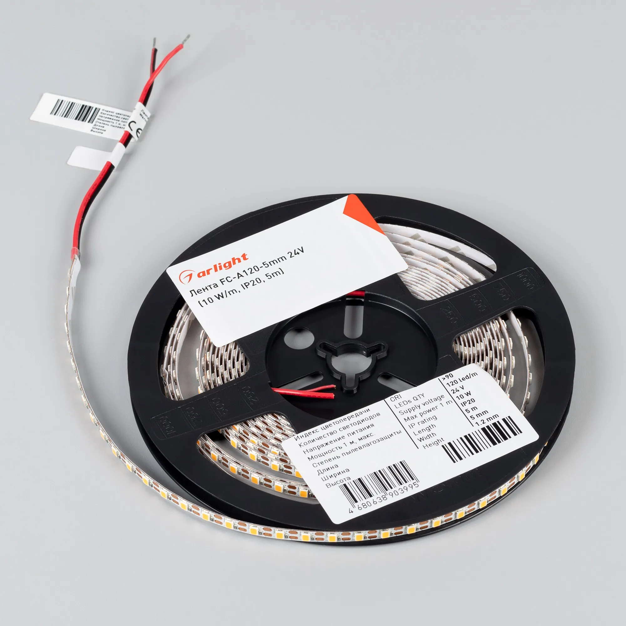 Светодиодная лента FC серии A120 с малым шагом резки. Светодиоды SMD 2835, 120 шт/м, белая плата, ширина 5 мм, скотч 3M. Цвет ТЕПЛЫЙ 3000K, индекс цветопередачи CRI>90, угол 120°. Питание 24 В, мощность 10 Вт/м (50 Вт на 5 м). Размеры 5000x5x1.2 мм. Мин. отрезок 8.33 мм, 1 светодиод. Цена за 1 м. Обязательна установка на профиль.