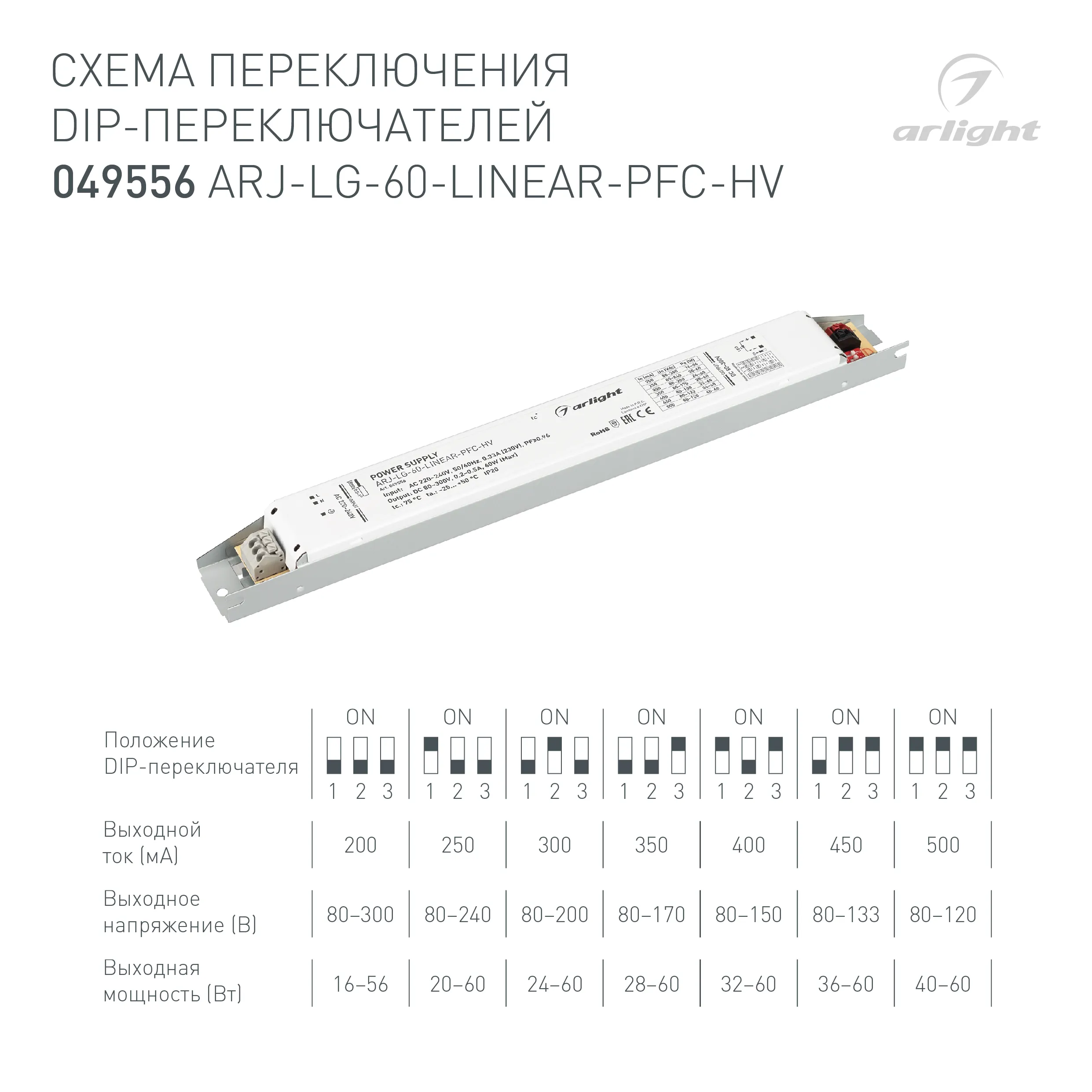 Наши специалисты знают все о продукции Arlight и с радостью помогут Вам выбрать комплектующие к товару "Блок питания ARJ-LG-60-LINEAR-PFC-HV (60W, 80-300V, 0.2-0.5A) (Arlight, IP20 Металл, 5 лет)", или другие товары из раздела "регулировка DIP-переключателем".