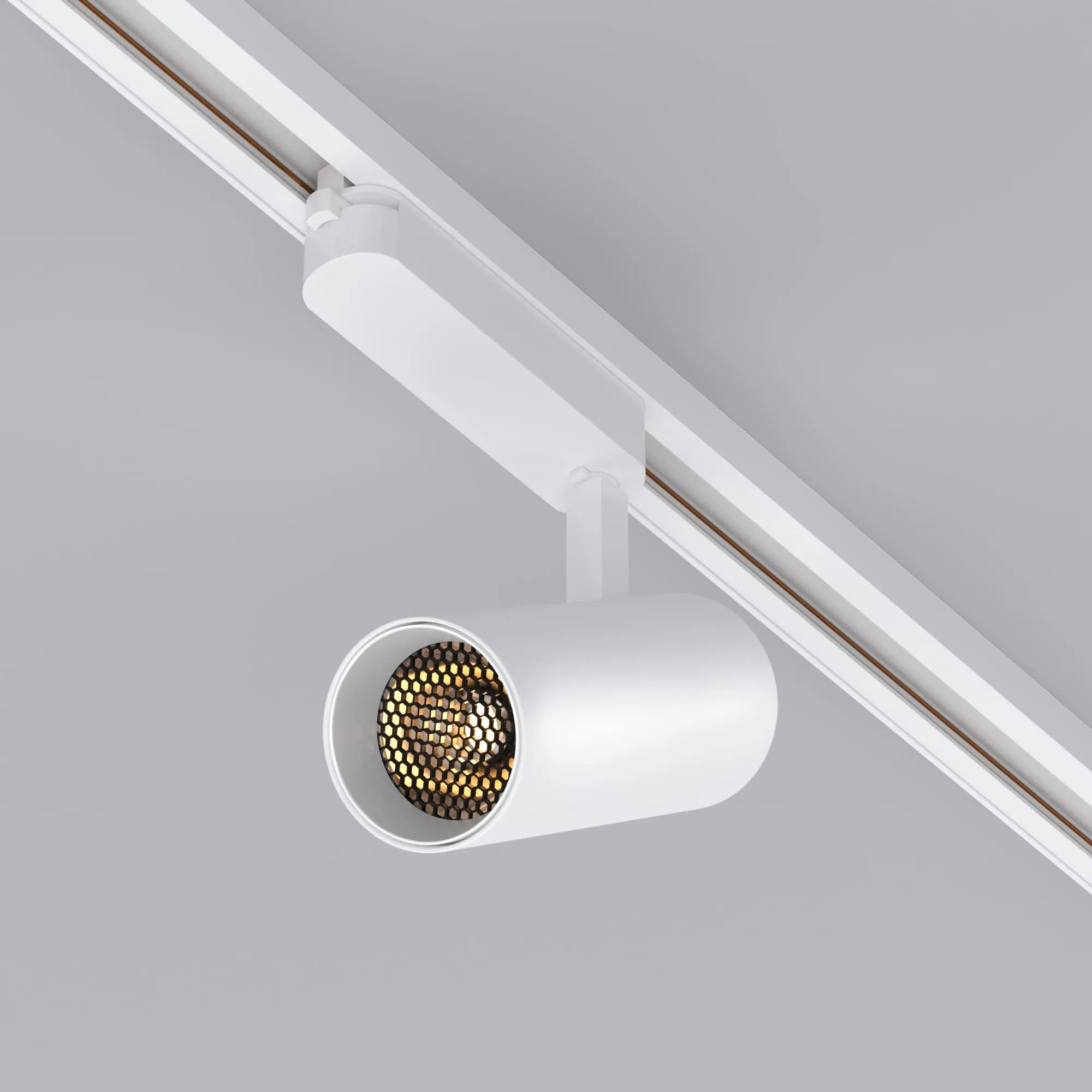Светильник для треков/шин 2 провода. Мощность 15 Вт, св. поток без решетки honeycomb 1500 лм, 100 лм/Вт, с решеткой honeycomb 990 лм, 66 лм/Вт, дневной 4000 K, CRI>90, угол 36°, напряжение питания 230 В. Белый круглый корпус из алюминия, материал линзы PMMA, степень защиты IP20. Размер: диаметр 60 мм, длина световой части 141 мм. Монтаж на трек 1-фазный. Драйвер встроенный 350 мА 25-40 В, пульсация <5%.