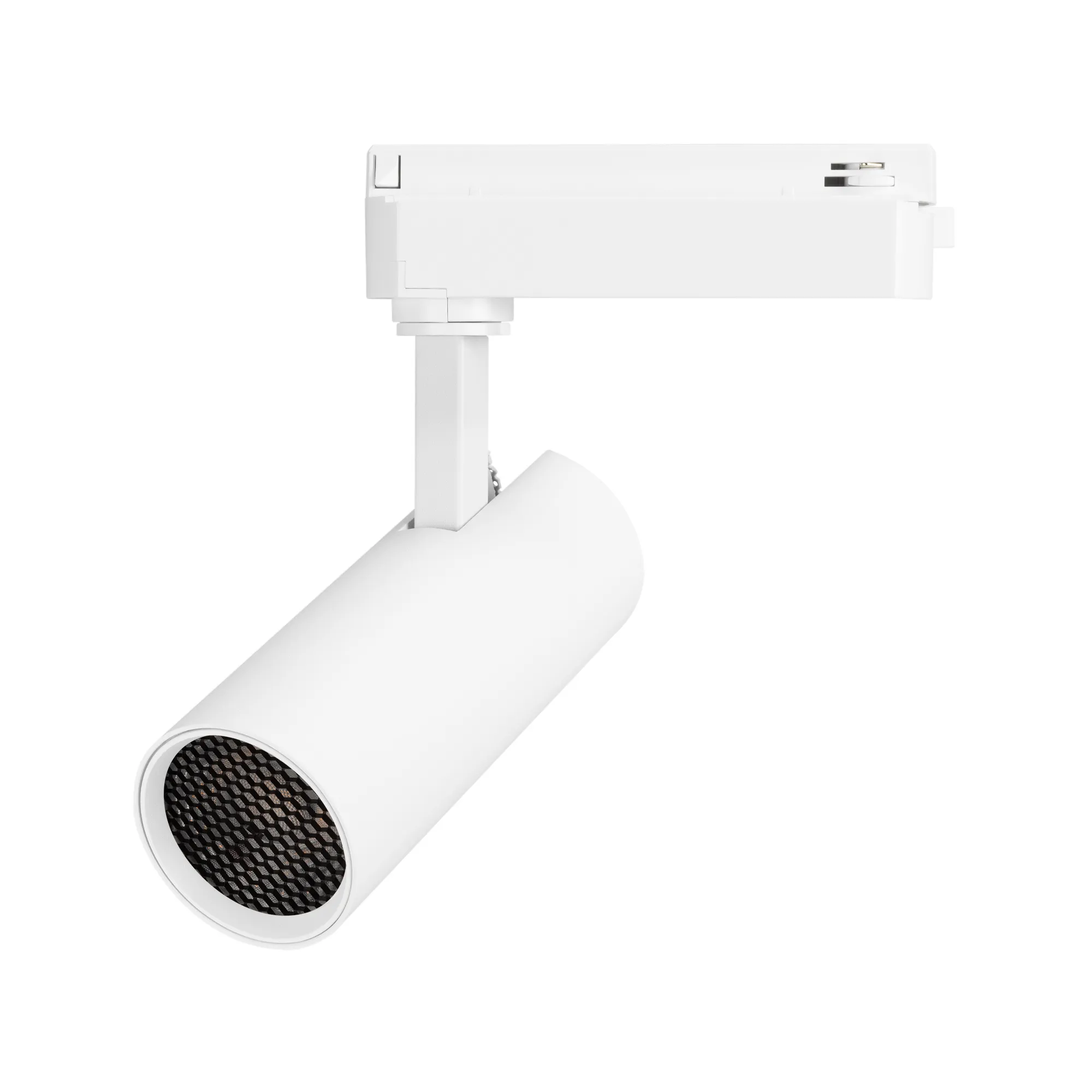 Светильник для треков/шин 2 провода. Мощность 10 Вт, св. поток без решетки honeycomb 1000 лм, 100 лм/Вт, с решеткой honeycomb 660 лм, 66 лм/Вт, теплый 3000 K, CRI>90, угол 15°, напряжение питания 230 В. Белый круглый корпус из алюминия, материал линзы PMMA, степень защиты IP20. Размер: диаметр 55 мм, длина световой части 141 мм. Монтаж на трек 1-фазный. Драйвер встроенный 25-40 В, 250мА., пульсация <5%.
