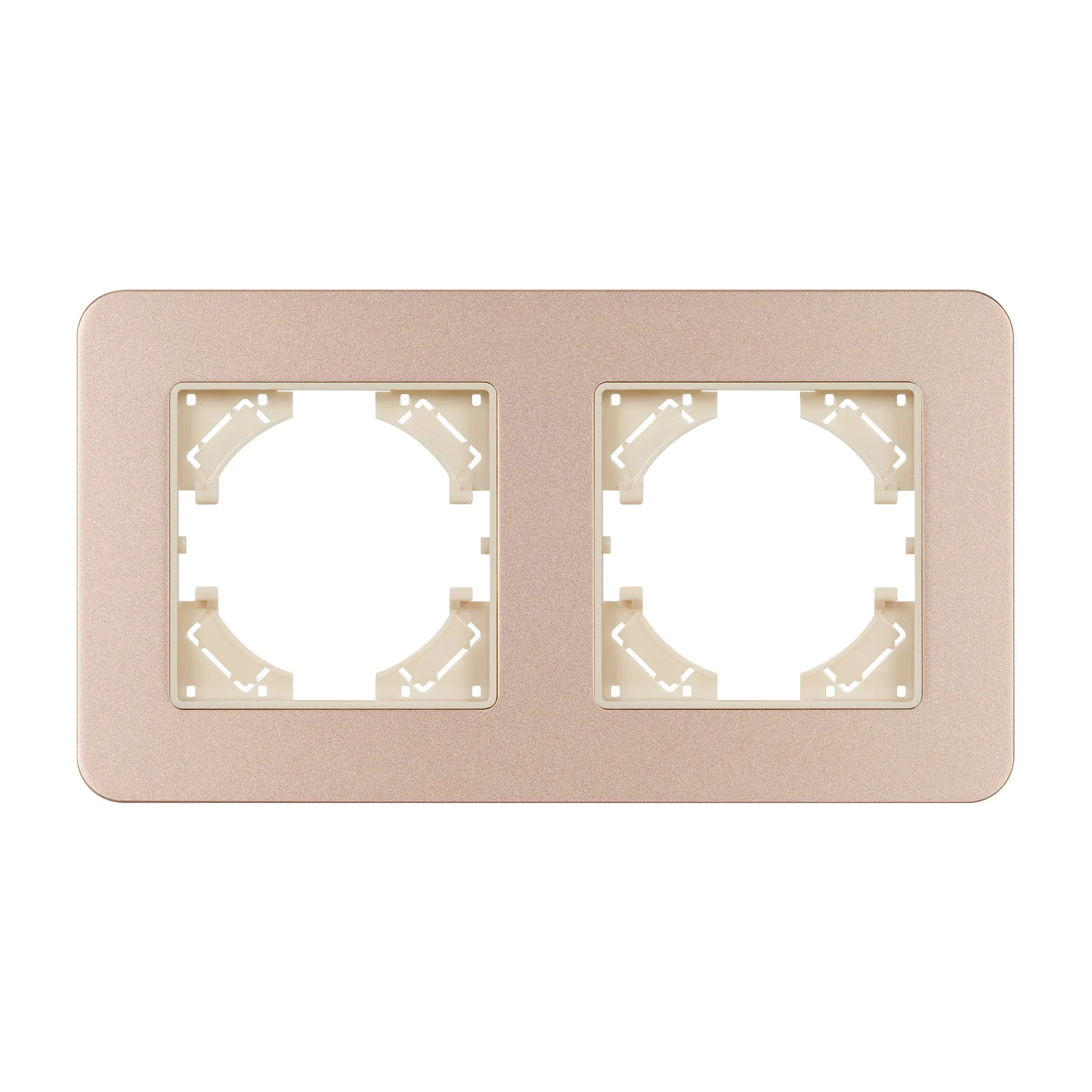 Рамка алюминиевая на 2 поста, под встраиваемый механизм. Цвет - золотой с Soft-Touch покрытием. Среднего уровня герметичности IP20. Ориентация монтажа - горизонтальная (основным ориентиром служат посадочные выступы для накладки механизма).