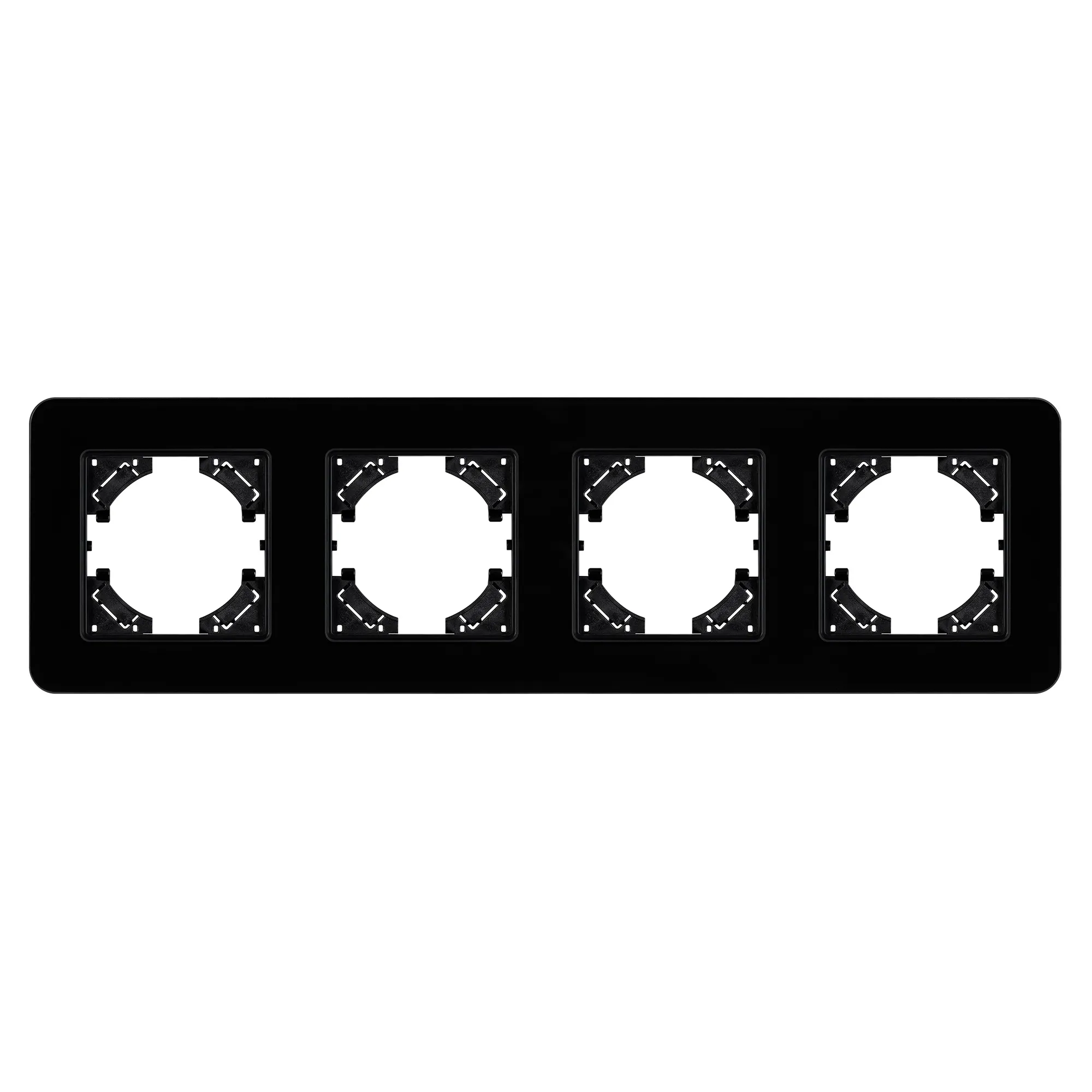 Рамка стеклянная на 4 поста, под встраиваемый механизм. Цвет - черный. Среднего уровня герметичности IP20. Ориентация монтажа - горизонтальная (основным ориентиром служат посадочные выступы для накладки механизма).