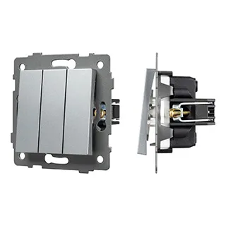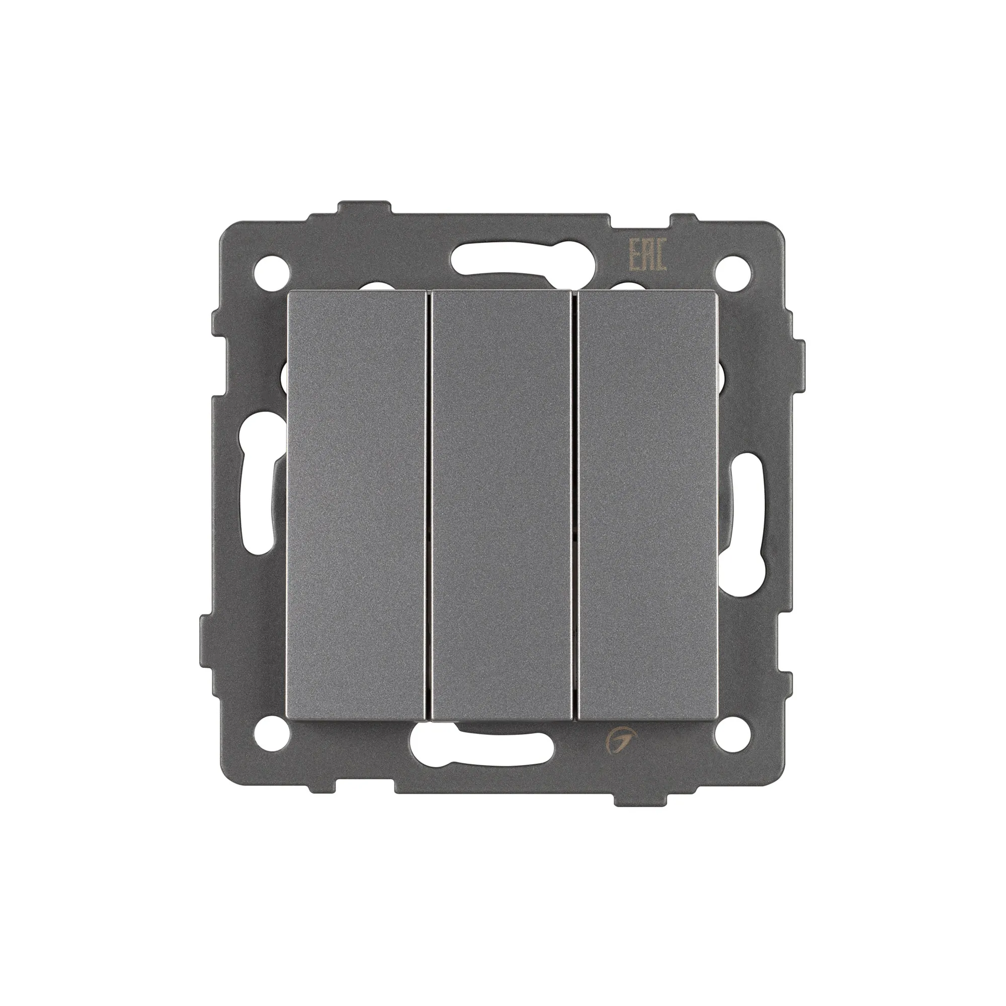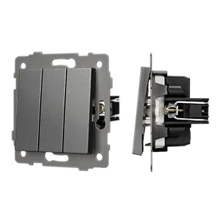 Механизм выключателя света клавишный на 1 пост 3 клавиши (непроходной). Цвет - серый. Без фронтальной рамки. Уровень пылевлагозащиты IP20. Выключатель устанавливается в стандартный круглый подрозетник.