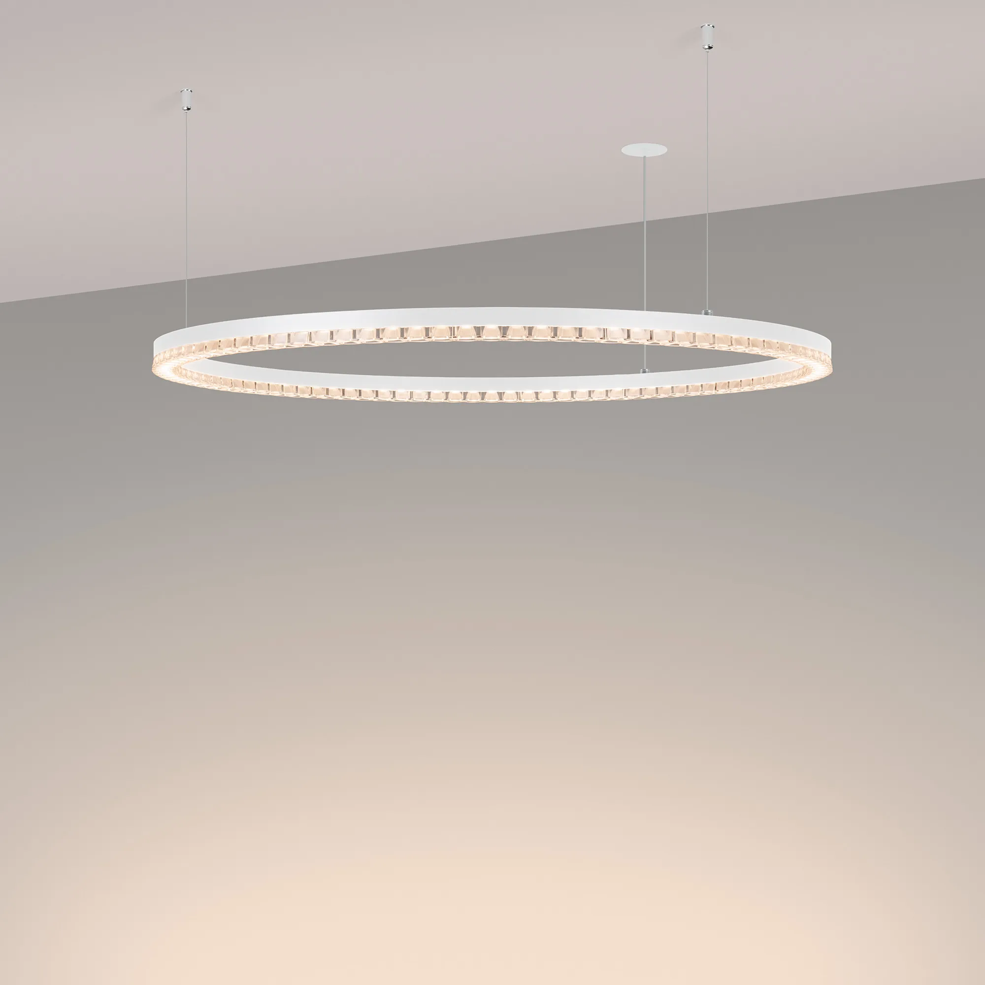 Под заказ. Подвесной светильник. Мощность 40 Вт, св. поток 3340 лм, 80-95 лм/Вт, теплый 3000 K, CRI>90, угол 45°, напряжение питания 230 В. Белый круглый корпус из алюминия, экран PMMA, степень защиты IP20. Размер: диаметр 850 мм, высота 34мм, ширина профиля 30 мм, размер чаши: диаметр 65 мм, высота 26 мм. Монтаж подвесной, длина подвеса 1200 мм, тип чаши встраиваемый, диаметр установочного отверстия чаши 60 мм. Драйвер 27-38 В, 1050 мА. Пульсация <0.3 %.