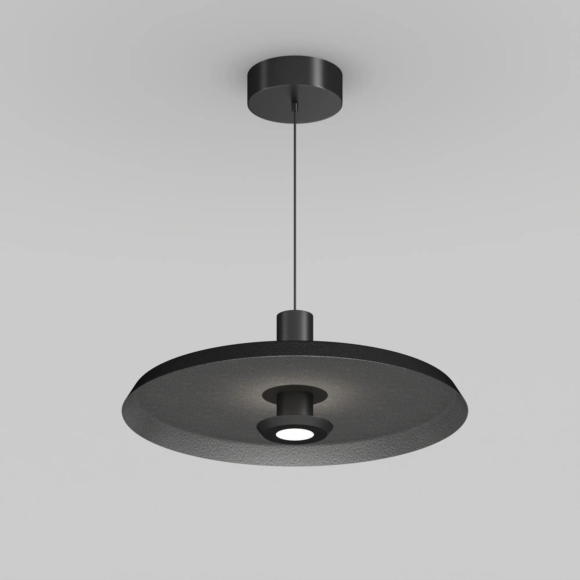 Подвесной светильник. Мощность 12 Вт, св. поток 768 лм, 64 лм/Вт, теплый 3000 K, CRI>94, угол 36°, напряжение питания 230 В. Темно-серый фигурный плафон из переработанного фетра со светло-серой внутренней поверхностью, линза-рассеиватель из PMMA, степень защиты IP20. Размер: диаметр 450 мм, высота 145 мм. Монтаж подвесной, длина подвеса 2000 мм, регулируемая. В комплекте 2 вида чаш. Габариты чаши (встраиваемая) Ø80 х 23 мм, врезное отверстие Ø60 мм. Габариты чаши (накладная) Ø120 x 35 мм. Драйвер 59В, 300 мА, пульсация <1%. Управление по TRIAC.