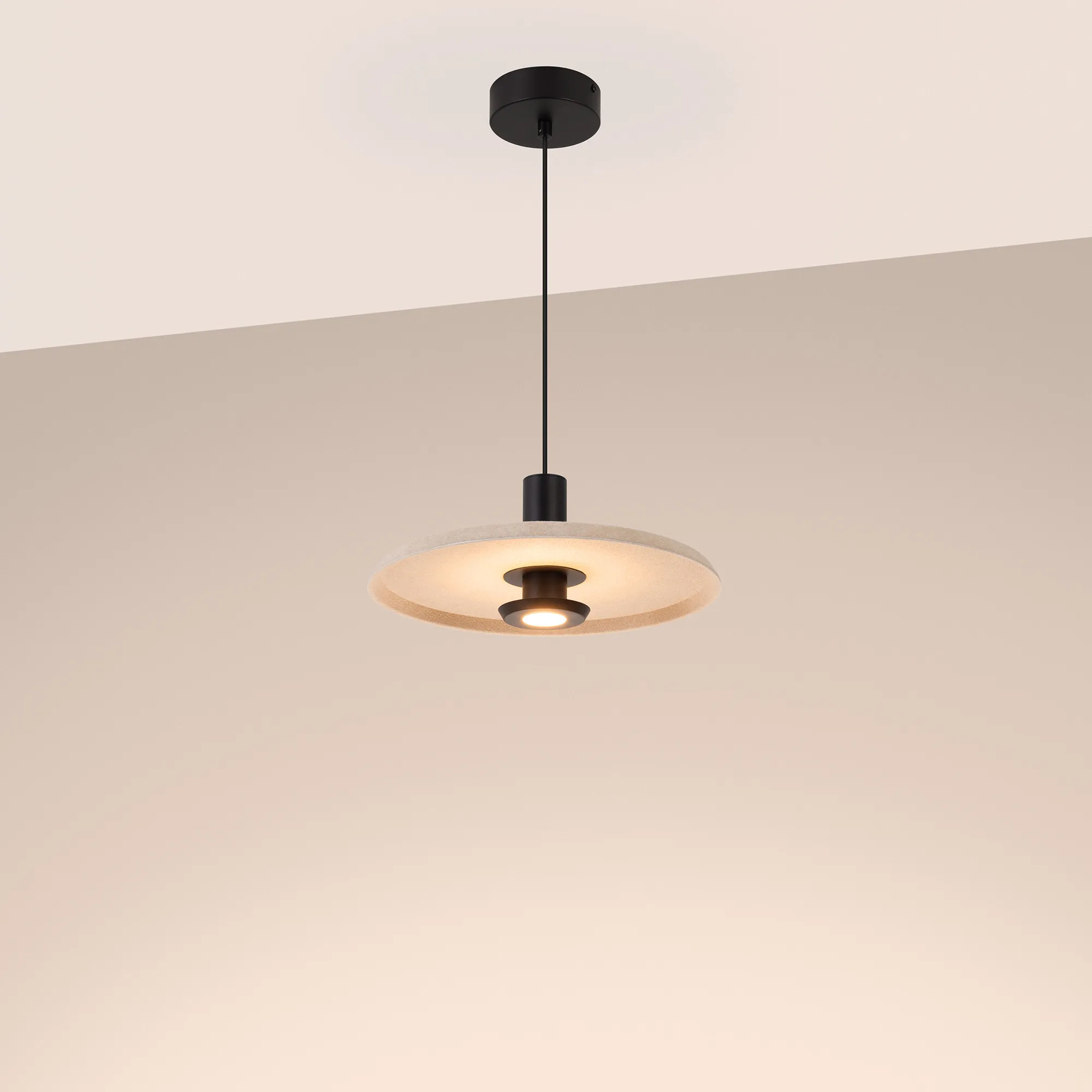 Подвесной светильник. Мощность 12 Вт, св. поток 597 лм, 49 лм/Вт, теплый 2700 K, CRI>94, угол 36°, напряжение питания 230 В. Бежевый фигурный корпус из переработанного фетра с бежевой внутренней поверхностью, линза-рассеиватель из PMMA, степень защиты IP20. Размер: диаметр 350 мм, высота 145 мм. Монтаж подвесной, длина подвеса 2000 мм, регулируемая. В комплекте 2 вида чаш. Габариты чаши (встраиваемая) Ø80 х 23 мм, врезное отверстие Ø60 мм. Габариты чаши (накладная) Ø120 x 35 мм. Драйвер 59 В, 300 мА, пульсация <1%. Управление по TRIAC.
