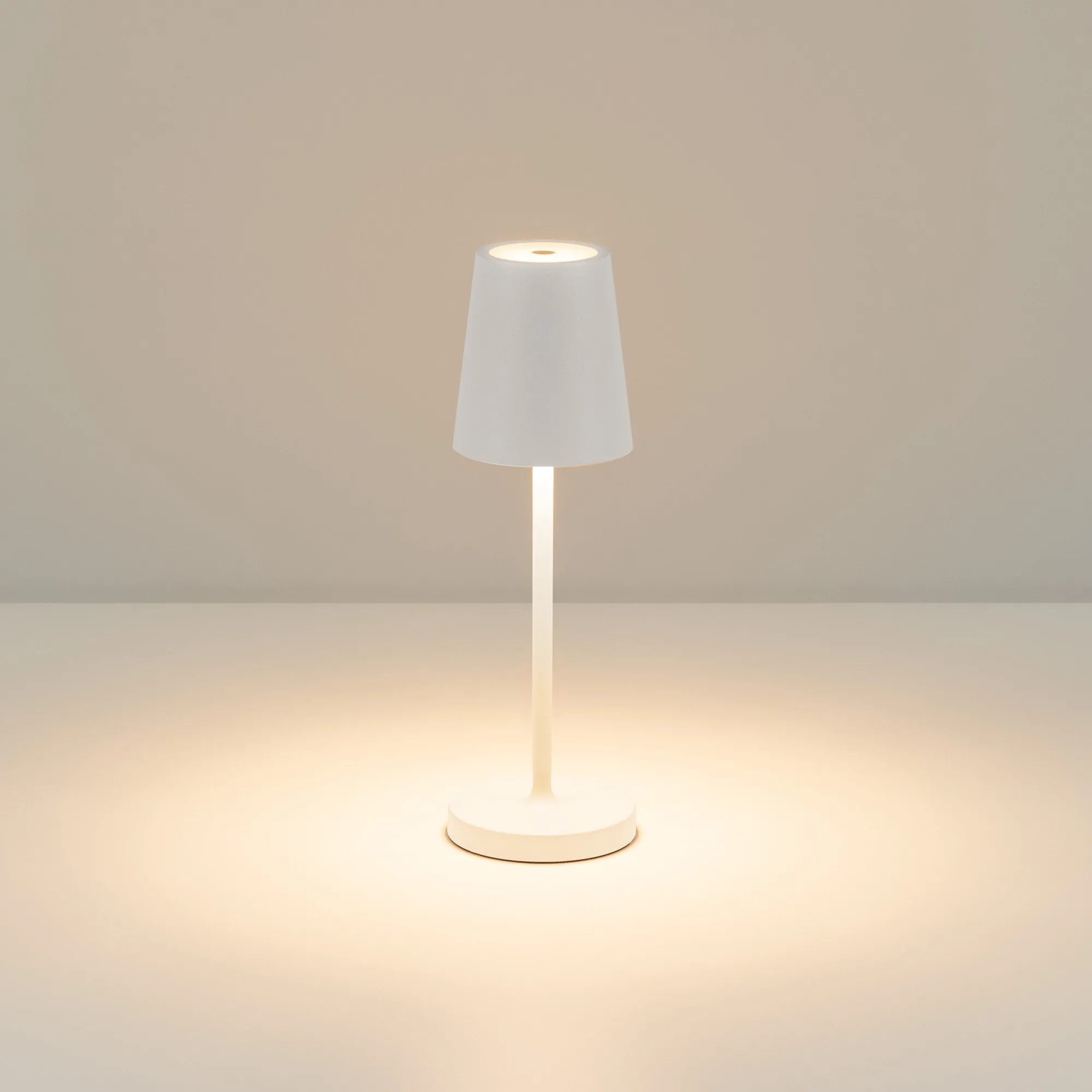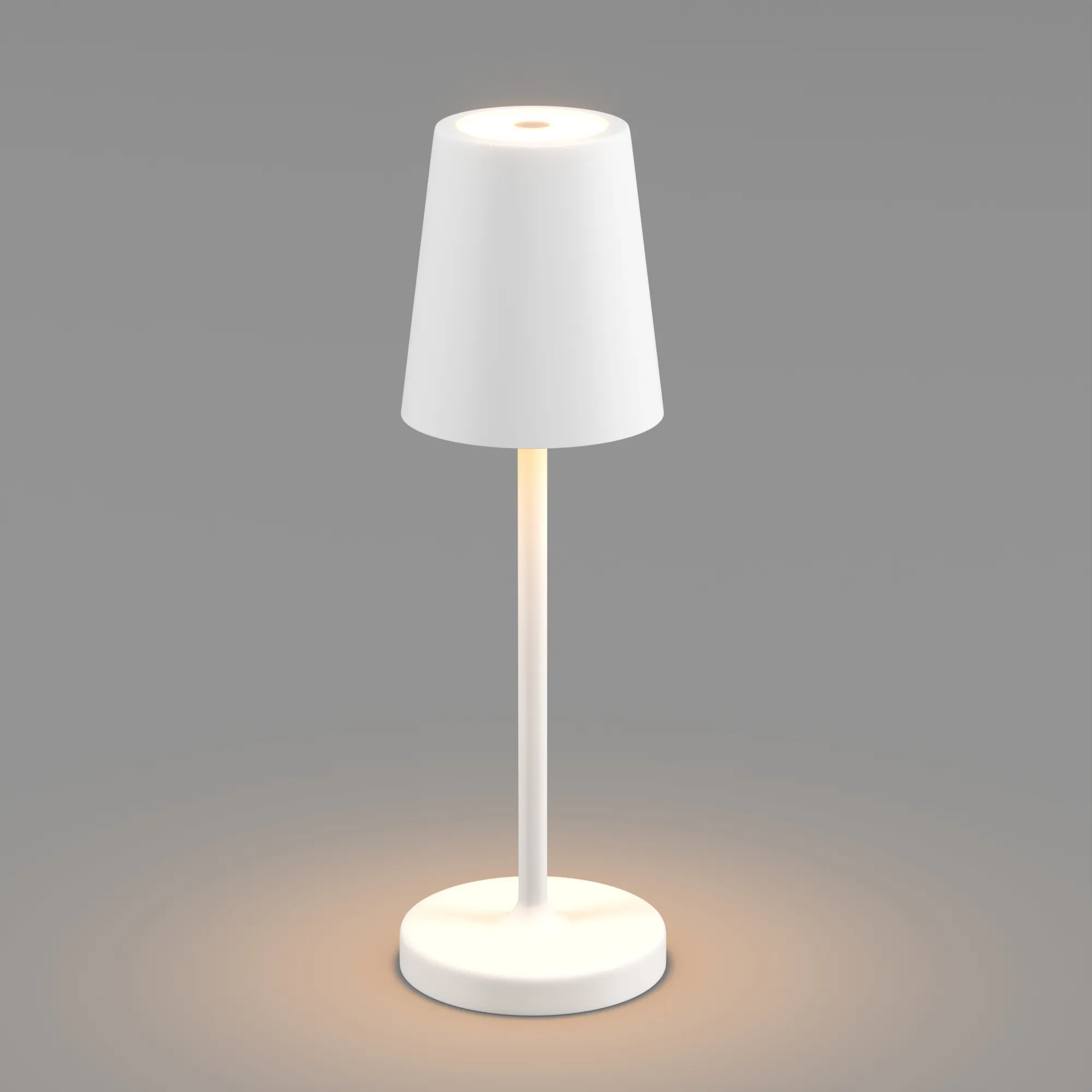 Настольный светильник со встроенным аккумулятором 1.5Вт, алюминиевый корпус, цвет белый. Цвет ТЕПЛЫЙ БЕЛЫЙ 2200-2700-3000K, св.поток 110-130 лм, CRI(Ra)>80, угол 90°. Размер Ф75x250мм. IP54. Зарядка от сети переменного тока AC220-240V. Тип встроенного аккумулятора 1500мАч Li-ion, напряжение батареи 3.7V