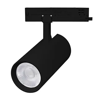 Светильник для треков/шин 4 провода с управлением TRIAC. Мощность 40Вт, св. поток без решетки honeycomb 4000 лм, 100 лм/Вт, с решеткой honeycomb 2640 лм, 66 лм/Вт, теплый 3000 K, CRI>90, угол 36°, напряжение питания 230 В. Черный круглый корпус из алюминия, материал линзы PMMA, степень защиты IP20. Размер: диаметр 90 мм, длина световой части 141 мм. Монтаж на трек 3-фазный. Драйвер встроенный 24-42 В, 750мА., пульсация <5%