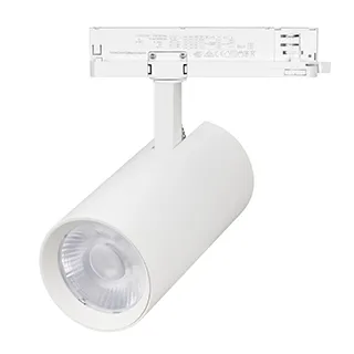 Светильник для треков/шин 4 провода с управлением DALI. Мощность 30 Вт, св. поток без решетки honeycomb 3000 лм, 100 лм/Вт, с решеткой honeycomb 1980 лм, 66 лм/Вт, теплый 3000 K, CRI>90, угол 36°. Белый круглый корпус из алюминия, материал линзы PMMA, степень защиты IP20. Размер: диаметр 90 мм, длина световой части 141 мм. Входное напряжение AC220-240V. Драйвер встроенный 10-42В (300-800 мА), 50/60Гц, максимальная мощность 42W. Монтаж на трек 3-фазный.