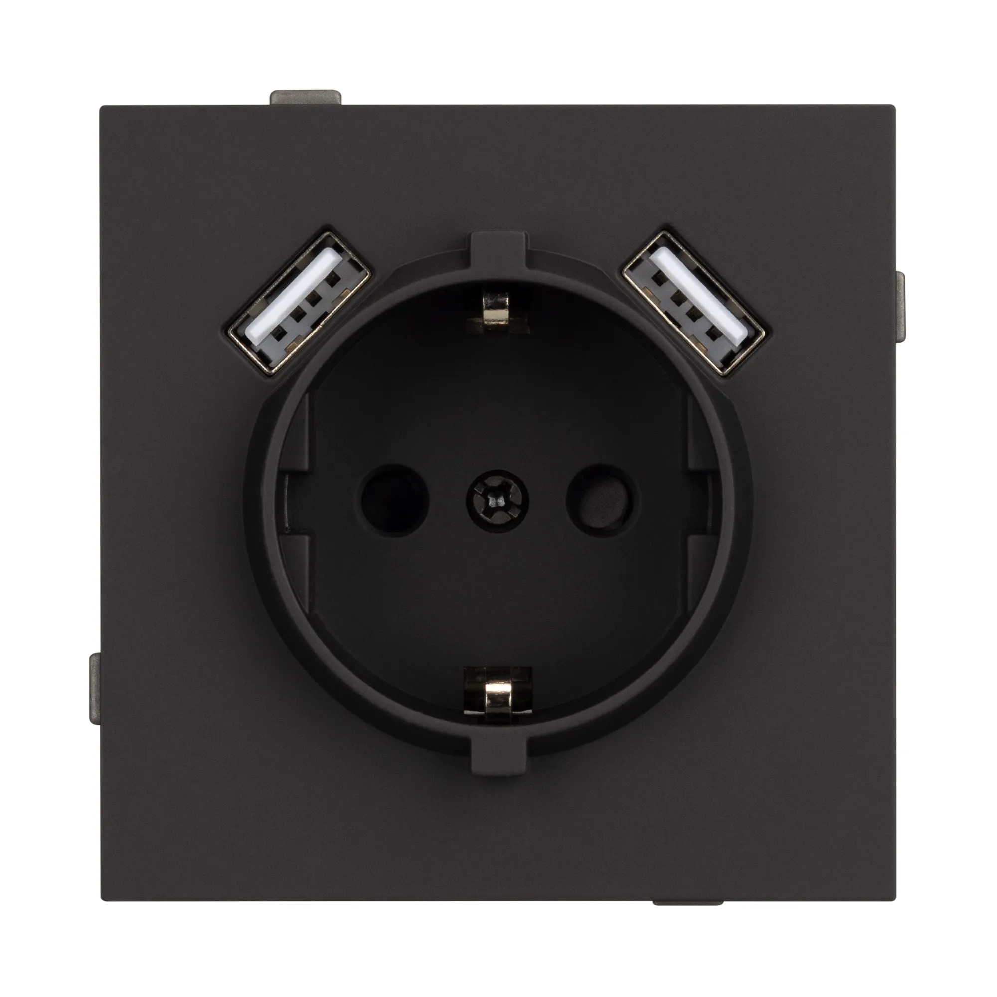 Механизм розетки с заземлением на 1 пост и 2USB Type A порта. Цвет - черный, с Soft-Touch покрытием. Без фронтальной рамки. Уровень пылевлагозащиты IP20. Розетка устанавливается в стандартный подрозетник круглого сечения диаметром 60мм.