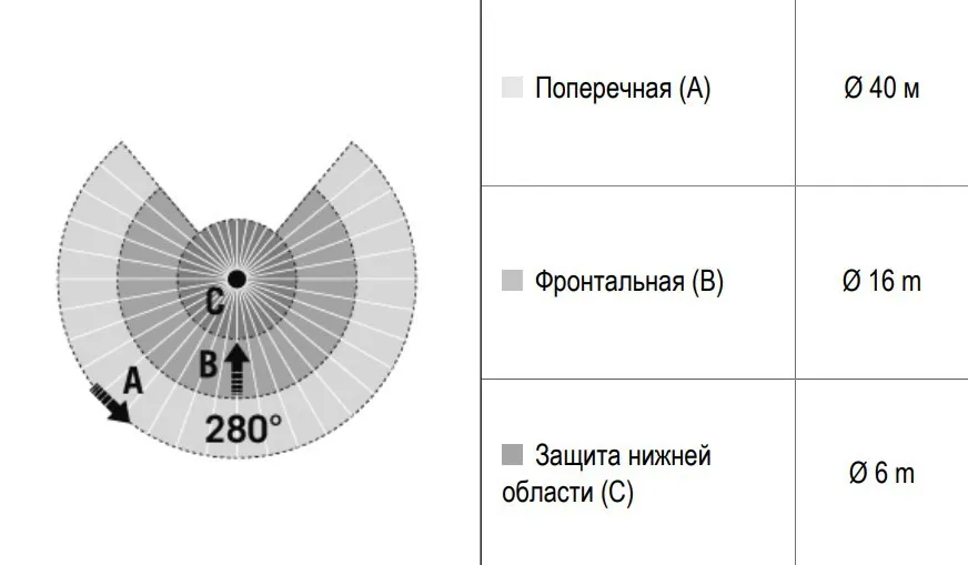 Угол обнаружения Защита нижней области обнаружения 280° (3 x 95° регулируются отдельно) и 360°