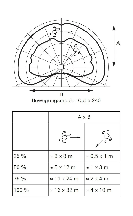 • Выход сигнала отсутствия, независимый от яркости. Параметрирование задержки включения и времени работы по инерции. В этом случае время работы по инерции истекает, как только кто-либо появляется в зоне обзора. Возможность циклической отправки текущего статуса в зависимости от состояния.