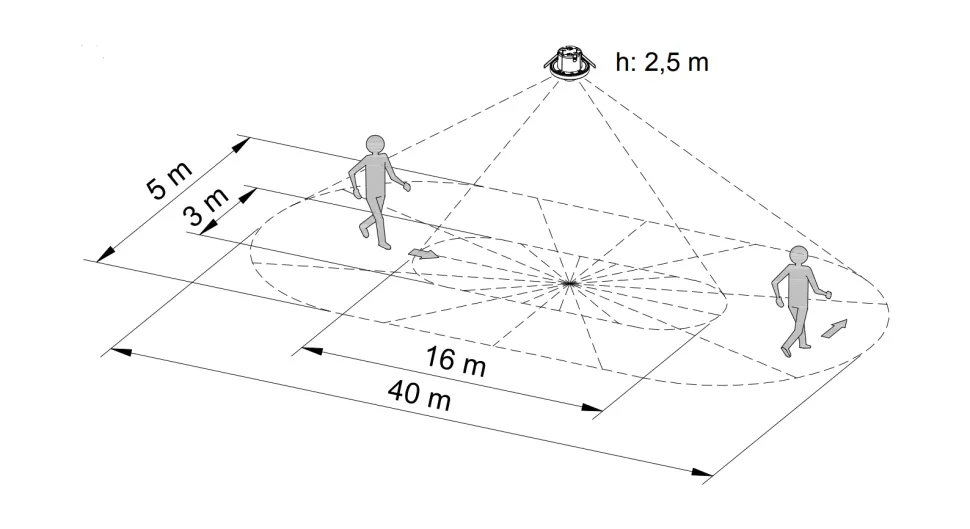 • Угол обнаружения 360º, прямоугольная область 40 x 5 м.
