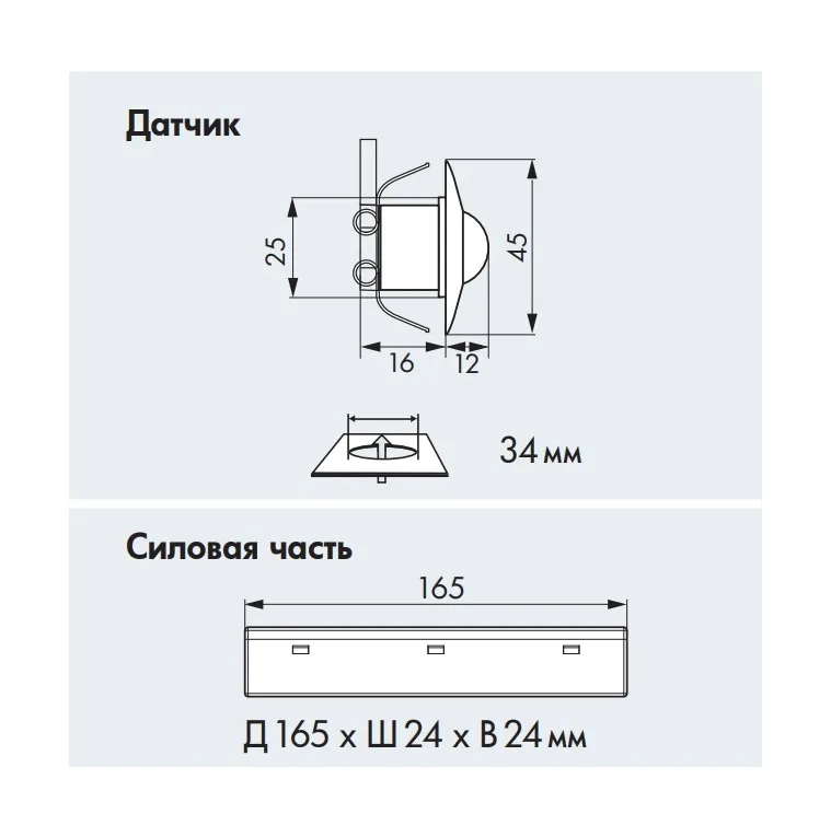 • Габариты Датчик: Ø 45 x В 28 мм. Силовая часть: Д 165 x Ш 24 x В 24 мм