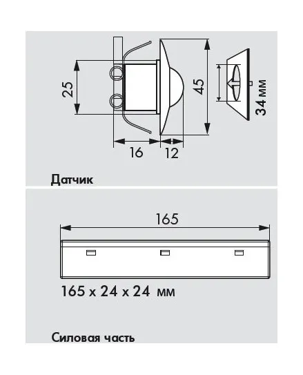 - Габариты Датчик: Ø 45 x H 28 мм. Силовая часть: Д 165 x Ш 24 x В 24 мм