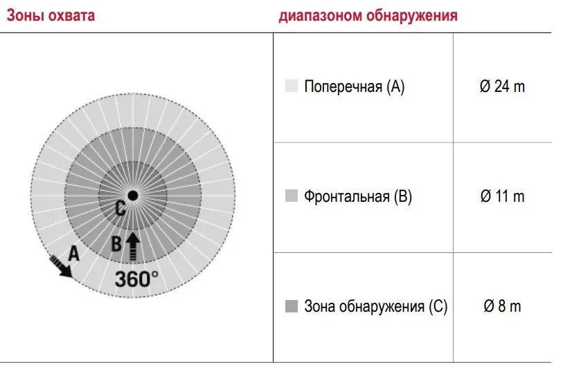| Угол охвата, диапазон обнаружения | Ø 8 м |