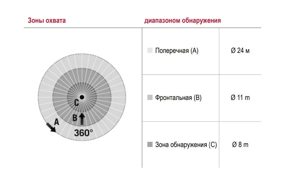 • Дальность действия до 24м в диаметре при рекомендованной монтажной высоте 3 м
